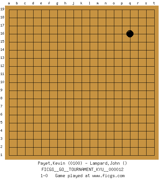 Last move : 1-0 2006 December 29 20:51:24 [Event "FICGS__GO__TOURNAMENT_KYU__000012"] [Site "FICGS"] [Date "2006.11.29"] [Round "1"] [Black "Payet,Kevin"] [White "Lampard,John"] [Result "1-0"] [Rating 1 "0100"] 1.q16 1-0 This go game has been lost on time (started : 2006.11.29 15:20:31) Here are the names of the openings (joseki) played in the four corners : Player Black won this Go (weiqi, baduk) game. Follow this game move after move (download)The comb formation is alive. (Anonymous) Yoga is 99% practice and 1% knowledge. (Sri Krishna Pattabhi Jois)