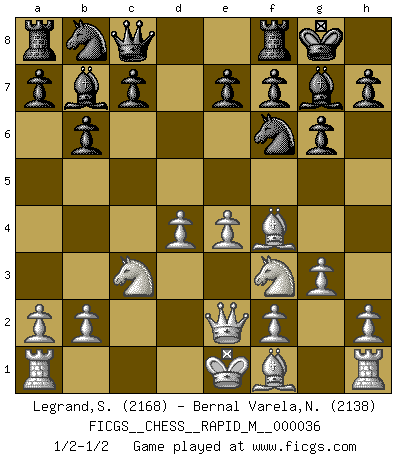Last move : 1/2-1/2 2011 January 30 8:10:46 [Event "FICGS__CHESS__RAPID_M__000036"] [Site "FICGS"] [Date "2010.11.16"] [Round "1"] [White "Legrand,Stephane"] [Black "Bernal Varela,Nelson"] [Result "1/2-1/2"] [WhiteElo "2168"] [BlackElo "2138"] 1.d4 Nf6 2.c4 g6 3.Nf3 Bg7 4.Nc3 d5 5.Qb3 dxc4 6.Qxc4 O-O 7.e4 b6 8.Bf4 Bb7 9.Qe2 Qc8 10.g3 Nh5 11.Be3 Nf6 12.Bf4 Nh5 13.Be3 Nf6 14.Bf4 1/2-1/2 King's Indian, 3.Nf3 Kingside Castling by player Black (move 6) This chess game ended in a draw. Follow this game move after move (download)After black's reply to 1.e4 with 1..e5, leaves him always trying to get into the game. (Howard Staunton) Der beste Spieler in einem Turnier gewinnt es nie. Er landet auf Platz zwei oder drei. (Siegbert Tarrasch) Coloca el contenido de las piezas del Ajedrez en un sombrero, agitalo vigorosamente, arrojalas en un tablero desde una altura de 30 centimetros y así obtendras el estilo de Steinitz. (H. E. Bird) Les échecs, c'est l'imagination. (David Bronstein) If we knew what we were doing, we would not call it research. (Albert Einstein)