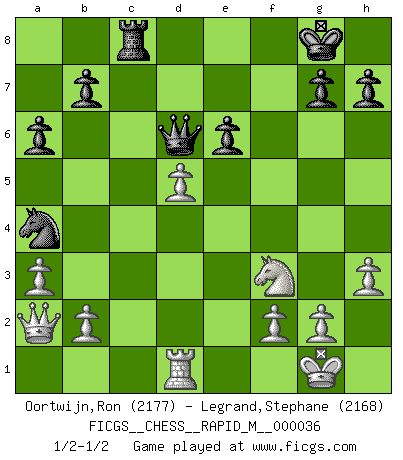 Last move : 1/2-1/2 2011 January 29 19:57:35 [Event "FICGS__CHESS__RAPID_M__000036"] [Site "FICGS"] [Date "2010.11.16"] [Round "1"] [White "Oortwijn,Ron"] [Black "Legrand,Stephane"] [Result "1/2-1/2"] [WhiteElo "2177"] [BlackElo "2168"] 1.d4 d5 2.c4 e6 3.Nc3 Nf6 4.cxd5 exd5 5.Bg5 Be7 6.e3 O-O 7.Bd3 Nbd7 8.Nf3 c6 9.Qc2 Re8 10.h3 Nf8 11.O-O Be6 12.Rfe1 Rc8 13.Rac1 N6d7 14.Bf4 c5 15.Bf5 Nb6 16.dxc5 Bxc5 17.Red1 a6 18.Be5 Qe7 19.a3 Bd6 20.Bxd6 Qxd6 21.Bxe6 fxe6 22.e4 Nfd7 23.Qb3 Nc5 24.Qa2 Nca4 25.Nxa4 Nxa4 26.Rxc8 Rxc8 27.exd5 1/2-1/2 QGD : Exchange, positional line Kingside Castling by player Black (move 6) Kingside Castling by player White (move 11) This chess game ended in a draw. Follow this game move after move (download)Man is a frivolous, a specious creature, and like a Chess player, cares more for the process of attaining his goal than for the goal itself. (Dostoyevsky) Fischer ist das größte Genie, das je vom Schachhimmel heruntergestiegen ist. (Mikhail Nekhemyevich Tal) El pensamiento metódico es mas útil en el Ajedrez que la inspiración. (C. J. S. Purdy) En blitz, le Cavalier l'emporte sur le Fou. (Vlastimil Hort) My poor ole parrot... Is not in the circulation of displays ....poo hoo hoo :) (Wayne Lowrance's enigma)