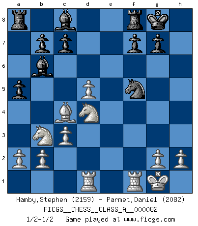 Last move : 1/2-1/2 2011 March 5 16:50:10 [Event "FICGS__CHESS__CLASS_A__000082"] [Site "FICGS"] [Date "2010.11.17"] [Round "1"] [White "Hamby,Stephen"] [Black "Parmet,Daniel"] [Result "1/2-1/2"] [WhiteElo "2159"] [BlackElo "2082"] 1.e4 e5 2.Nf3 Nc6 3.d4 exd4 4.Nxd4 Bc5 5.Be3 Qf6 6.c3 Nge7 7.Bc4 Ne5 8.Be2 Qg6 9.O-O d6 10.f3 O-O 11.Nd2 d5 12.f4 Ng4 13.f5 Nxe3 14.fxg6 Nxd1 15.gxh7+ Kxh7 16.Raxd1 Kg8 17.N2b3 Bb6 18.exd5 a5 19.Bc4 Nf5 1/2-1/2 Scotch game Kingside Castling by player White (move 9) Kingside Castling by player Black (move 10) This chess game ended in a draw. Follow this game move after move (download)Chess opens and enriches your mind. (Saudin Robovic) Ich hatte Angst gegen einen russischen Großmeister zu verlieren, und er befürchtete gegen einen kleinen Jungen zu verlieren. (über ein Remis gegen Juri Awerbach). (Robert James Fischer) Puntos débiles o agujeros en la posición de tu oponente deben de ser ocupados por piezas, no Peones. (Siegbert Tarrasch) Si le désir cupide (et stupide) de gagner est une inépuisable source de souffrance, une combinaison brillante sur l'échiquier est une découverte : le coquelicot qui s'épanouit lorsque apparaît la Voie Lactée. (Arrabal) I've lost money so fast in these clubs it's left me reeling. I've read every poker book ever written, but the only way to get better at the game is to go out and play with people who are really good. The problem is, you stand to lose a lot of money doing it. (Matt Damon)
