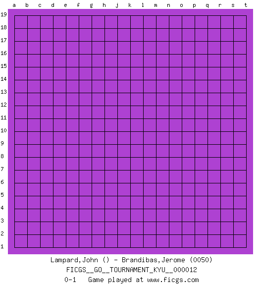 Last move : 0-1 2006 December 29 20:51:24 [Event "FICGS__GO__TOURNAMENT_KYU__000012"] [Site "FICGS"] [Date "2006.11.29"] [Round "1"] [Black "Lampard,John"] [White "Brandibas,Jerome"] [Result "0-1"] [Rating 2 "0050"] 0-1 This go game has been lost on time (started : 2006.11.29 15:20:31) Here are the names of the openings (joseki) played in the four corners : Player White won this Go (weiqi, baduk) game. Follow this game move after move (download)A meijin needs no joseki. (Anonymous) Life is pleasant. Death is peaceful. It's the transition that's troublesome. (Isaac Asimov)