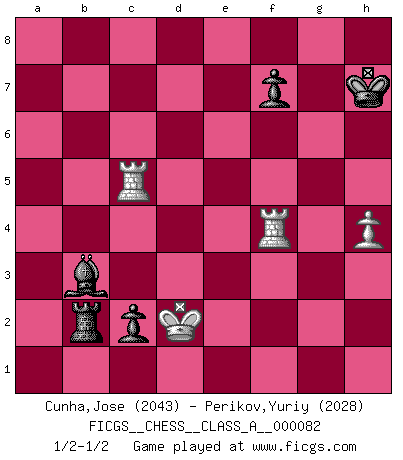 Last move : 1/2-1/2 2011 February 5 12:56:47 [Event "FICGS__CHESS__CLASS_A__000082"] [Site "FICGS"] [Date "2010.11.17"] [Round "1"] [White "Cunha,Jose"] [Black "Perikov,Yuriy"] [Result "1/2-1/2"] [WhiteElo "2043"] [BlackElo "2028"] 1.e4 e5 2.Nf3 Nc6 3.Bb5 a6 4.Ba4 Nf6 5.O-O Bd6 6.Re1 O-O 7.c3 b5 8.Bc2 Re8 9.d4 Bb7 10.Nbd2 h6 11.h3 Qb8 12.a3 Bf8 13.dxe5 Nxe5 14.Nxe5 Rxe5 15.Nf3 Rxe4 16.Bxe4 Bxe4 17.Ne5 d5 18.Ng4 Nxg4 19.Qxg4 Qb6 20.Be3 Qd6 21.b4 Qc6 22.Bd4 a5 23.h4 Qg6 24.Qxg6 Bxg6 25.Bc5 Bf5 26.f3 Be6 27.Kf2 Ra6 28.Bxf8 Kxf8 29.a4 axb4 30.axb5 Rb6 31.cxb4 Rxb5 32.Reb1 Ke7 33.Ke3 Kd6 34.Ra6+ c6 35.Rb2 Bc8 36.Ra8 Be6 37.g4 g6 38.Kd4 h5 39.gxh5 gxh5 40.Rg8 Ke7 41.R8g2 Bf5 42.Rg5 Bg6 43.Kc3 Ke6 44.Rb3 Ke7 45.f4 Be4 46.Re5+ Kf6 47.Ra3 Bf3 48.Ra6 d4+ 49.Kxd4 Rxb4+ 50.Ke3 Bh1 51.Ra8 Rb3+ 52.Kd2 Rb4 53.Rxh5 Rxf4 54.Ke3 Rb4 55.Rh6+ Kg7 56.R6h8 Bd5 57.Rag8+ Kf6 58.Rh5 Be6 59.Rg1 c5 60.Rf1+ Kg6 61.Rg5+ Kh6 62.Rf6+ Kh7 63.Rf4 c4 64.Kd2 c3+ 65.Ke3 c2 66.Rc5 Rb2 67.Kd2 Bb3 1/2-1/2 Ruy Lopez : 5.O-O Kingside Castling by player White (move 5) Kingside Castling by player Black (move 6) 10 pieces endgame at move 53 : White KRRPP , Black KRBPP WHITE : King + 2 Rooks 2 Pawns BLACK : King + 1 Rook 1 Bishop 2 Pawns 9 pieces endgame at move 53 : White KRRP , Black KRBPP WHITE : King + 2 Rooks 1 Pawn BLACK : King + 1 Rook 1 Bishop 2 Pawns This chess game ended in a draw. Follow this game move after move (download)Chess problems demand from the composer the same virtues that characterize all worthwhile art: originality, invention, conciseness, harmony, complexity, and splendid insincerity. (Vladimir Nabokov) Ich würde mich als ganz normalen Jungen bezeichnen [Im Alter von 12]. (Sergej Karjakin) El Peón aislado arroja penumbra sobre todo el tablero. (Aaron Nimzovich) Les Echecs ont trois composantes : le temps, l'espace et le matériel en dernier. (Mikhail Tal) Luck is what you have left over after you give 100 percent. (Langston Coleman)