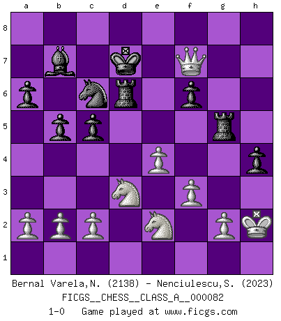 Last move : 1-0 2011 April 7 11:17:42 [Event "FICGS__CHESS__CLASS_A__000082"] [Site "FICGS"] [Date "2010.11.17"] [Round "1"] [White "Bernal Varela,Nelson"] [Black "Nenciulescu,Silviu"] [Result "1-0"] [WhiteElo "2138"] [BlackElo "2023"] 1.e4 e5 2.Nf3 Nc6 3.Bb5 a6 4.Bxc6 dxc6 5.O-O f6 6.d4 exd4 7.Nxd4 Bd6 8.Qh5+ g6 9.Qf3 h5 10.Qc3 Bd7 11.Qb3 c5 12.Ne2 Ne7 13.Bf4 Bc6 14.Rd1 Qd7 15.Bxd6 cxd6 16.Nbc3 g5 17.Rd2 b5 18.Rad1 Rd8 19.h4 Rg8 20.Rxd6 Qxd6 21.Rxd6 Rxd6 22.Ng3 Rg6 23.Nxh5 gxh4 24.Nf4 Rg5 25.f3 Bb7 26.Kh2 Re5 27.Nce2 Nc6 28.Qg8+ Kd7 29.Nd3 Rg5 30.Qf7+ 1-0 Ruy Lopez : Exchange, Gligoric variation Kingside Castling by player White (move 5) Player White won this chess game. Follow this game move after move (download)Spassky will not be psyched out by Fischer. (Mike Goodall) Ich war schon mal beim Dopingtest. Da musste ich Urin abgeben, während Dritte zusahen. (Elisabeth Pähtz) En el tablero, la mentira e hipocresía no sobreviven mucho. (Emanuel Lasker) La menace est plus forte que l'exécution. (Aaron Nimzovitch) Computers are like Old Testament gods; lots of rules and no mercy. (Joseph Campbell)