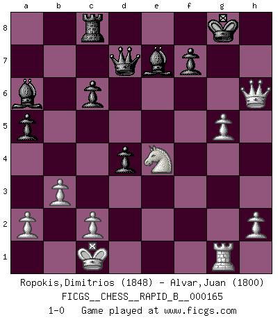 Last move : 1-0 2010 December 30 12:46:54 [Event "FICGS__CHESS__RAPID_B__000165"] [Site "FICGS"] [Date "2010.11.19"] [Round "1"] [White "Ropokis,Dimitrios"] [Black "Alvar,Juan"] [Result "1-0"] [WhiteElo "1848"] [BlackElo "1800"] 1.e4 c5 2.Nc3 Nc6 3.f4 e6 4.Nf3 d5 5.exd5 exd5 6.Bb5 Nf6 7.Ne5 Qc7 8.d4 a6 9.Bxc6+ bxc6 10.Qe2 Be7 11.dxc5 O-O 12.Be3 a5 13.O-O-O Ba6 14.Qf3 Rab8 15.Rhe1 Qb7 16.b3 Rfe8 17.Bd4 Bf8 18.g4 Rec8 19.g5 Nd7 20.Nxd7 Qxd7 21.f5 Rb4 22.f6 Rxd4 23.Rxd4 Bxc5 24.Rh4 d4 25.Rxh7 Kxh7 26.Qh5+ Kg8 27.fxg7 Kxg7 28.Qh6+ Kg8 29.Ne4 Be7 30.Rg1 1-0 Sicilian : Grand Prix attack Kingside Castling by player Black (move 11) Queenside Castling by player White (move 13) Player White won this chess game. Follow this game move after move (download)No other master has such a terrific will to win. At the board he radiates danger, and even the strongest opponents tend to freeze, like rabbits when they smell a panther. Even his weaknesses are dangerous. As white, his opening game is predictable - you can make plans against it - but so strong that your plans almost never work. In the middle game his precision and invention are fabulous, and in the end game you simply cannot beat him. (Anonymous German Expert) Frage des Reporters: -Welche besonderen Umstände rechtfertigen das Anhalten der Uhren während einer Turnierpartie? Antwort: -Einen Fotographen zu strangulieren. (Siegbert Tarrasch) Un jugador que es sorprendido, esta derrotado a medias. (Proverbio) Le succès, c'est être capable d'aller d'échec en échec sans perdre son enthousiasme. (Winston Churchill) You know what they say : You lie down with the Devil, you wake up in Hell. (Horatio Caine, C.S.I. Miami)
