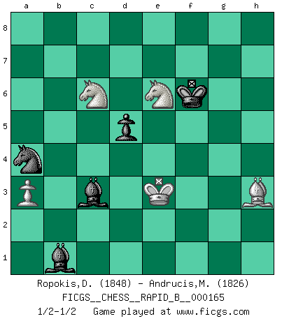 Last move : 1/2-1/2 2010 December 27 21:4:43 [Event "FICGS__CHESS__RAPID_B__000165"] [Site "FICGS"] [Date "2010.11.19"] [Round "1"] [White "Ropokis,Dimitrios"] [Black "Andrucis,Maris"] [Result "1/2-1/2"] [WhiteElo "1848"] [BlackElo "1826"] 1.e4 e5 2.f4 exf4 3.Nf3 g5 4.d4 g4 5.Ne5 Qh4+ 6.g3 fxg3 7.Qxg4 g2 8.Qxh4 gxh1Q 9.Nxf7 Be7 10.Qh5 Qxe4+ 11.Kd1 Qxd4+ 12.Bd2 c6 13.Nxh8 Kd8 14.Qxh7 Nf6 15.Qg7 d5 16.Nf7+ Ke8 17.Nh6 Na6 18.Nc3 Nc5 19.Ne2 Qf2 20.Bg2 Nfe4 21.Qg8+ Qf8 22.Qg6+ Kd7 23.Nf5 Bf6 24.c3 Be5 25.b4 Kc7 26.Nfd4 Nxd2 27.Kxd2 Na4 28.Rf1 Qd6 29.Rf7+ Bd7 30.Ne6+ Kb6 31.N6f4 Be8 32.Qxd6 Bxd6 33.Rf6 Kc7 34.Ne6+ Kd7 35.Bh3 Ke7 36.Rh6 Bxh2 37.Rh7+ Kf6 38.Rxb7 a5 39.bxa5 Rxa5 40.N2d4 Bd6 41.Rh7 Bg6 42.Nxc6 Bxh7 43.Nxa5 Be5 44.Nc6 Bxc3+ 45.Ke3 Bb1 46.a3 1/2-1/2 KGA : Soerensen gambit Promotion Queen by player Black (move 8) 10 pieces endgame at move 44 : White KBNNP , Black KBBNP WHITE : King + 1 Bishop 2 Knights 1 Pawn BLACK : King + 2 Bishops 1 Knight 1 Pawn This chess game ended in a draw. Follow this game move after move (download)By playing at Chess then, we may learn: First: Foresight... Second: Circumspection... Third: Caution... And lastly, we learn by Chess the habit of not being discouraged by present bad appearances in the state of our affairs, the habit of hoping for a favorable chance, and that of persevering in the secrets of resources. (Benjamin Franklin) Der zweitbeste Zug ist oft der einzig richtige. (Savielly Grigorievitsch Tartakower) Aún el Rey más flojo huye despavorido ante la amenaza de un Jaque doble. (Aaron Nimzowitsch) Shah mat. Le roi est mort. Cri de fierté d'un joueur venant de terrasser son adversaire, courtoisement, sans effusion de sang. Train yourself to let go of everything you fear to lose. (Master Yoda in Star Wars ep.3)