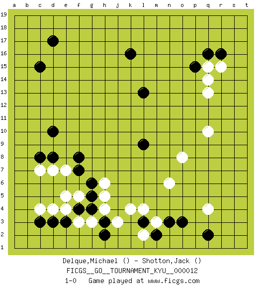 Last move : 1-0 2007 February 17 10:48:25 [Event "FICGS__GO__TOURNAMENT_KYU__000012"] [Site "FICGS"] [Date "2006.11.29"] [Round "1"] [Black "Delque,Michael"] [White "Shotton,Jack"] [Result "1-0"] 1.q16 c4 2.d17 q4 3.c15 k4 4.k16 q10 5.e3 e4 6.f4 d4 7.d3 f5 8.g4 h4 9.h3 j3 10.d10 g3 11.h2 f3 12.g5 h5 13.g6 e5 14.c3 h6 15.f7 e7 16.f8 d7 17.c8 c7 18.d8 n6 19.l9 o8 20.l13 q13 21.o3 q15 22.p15 r15 23.r16 q14 24.l3 m3 25.q2 l4 26.m2 l2 27.n3 1-0 This go game has been lost on time (started : 2006.11.29 15:20:31) Here are the names of the openings (joseki) played in the four corners : Corner d4 : c4 e3 Komoku (Somok, Xiao~mu`) 3-4 Point. The komoku (3-4) point is the traditional corner enclosure move.. Ikken Kakari (Hankan Keolch'im, Yi Gua`jiao~, 1-Space Low Pincer). The small knight move is the basic approach move to the 3-4 point stone. It has been continually used for over four centuries. There are limitless variations, with new moves constantly being discovered. Black 2 opens the door to a treaure store of joseki. Player Black won this Go (weiqi, baduk) game. Follow this game move after move (download)At the head of two stones in a row, play hane. (Anonymous) No man has ever achieved immortality in his own life time. (Unknown)
