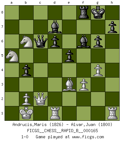 Last move : 1-0 2010 December 30 12:48:33 [Event "FICGS__CHESS__RAPID_B__000165"] [Site "FICGS"] [Date "2010.11.19"] [Round "1"] [White "Andrucis,Maris"] [Black "Alvar,Juan"] [Result "1-0"] [WhiteElo "1826"] [BlackElo "1800"] 1.e4 c5 2.Nc3 g6 3.Nf3 Bg7 4.d4 cxd4 5.Nxd4 Nc6 6.Be3 d6 7.f3 Nf6 8.Qd2 O-O 9.O-O-O Bd7 10.Kb1 Rc8 11.g4 Ne5 12.a3 Nc4 13.Bxc4 Rxc4 14.h4 b5 15.h5 a5 16.hxg6 fxg6 17.e5 b4 18.exf6 Bxf6 19.axb4 axb4 20.Nd5 e5 21.Nb3 Qa8 22.Nb6 Qc6 23.Na5 Rxc2 24.Qxc2 1-0 Sicilian : Closed Kingside Castling by player Black (move 8) Queenside Castling by player White (move 9) Player White won this chess game. Follow this game move after move (download)Chess is really ninety nine percent calculation. (Soltis) Das typische an einem Großmeister ist, daß er eine gewonnene Position schnell und schmerzlos gewinnt. (Irving Chernev) Los Peones son nacidos libres, y aún así, se encuentran encadenados por todos lados. (Rick Kennedy) Le moment que je préfère le plus dans une rencontre, c'est celui où je sens que la personnalité de l'adversaire se brise. (Robert Fischer) Now you put water in a cup, it becomes the cup; You put water into a bottle it becomes the bottle; You put it in a teapot it becomes the teapot. Water can flow or it can crash. Be water, my friend. (Bruce Lee)