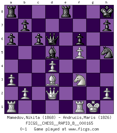 Last move : 0-1 2011 January 7 16:41:8 [Event "FICGS__CHESS__RAPID_B__000165"] [Site "FICGS"] [Date "2010.11.19"] [Round "1"] [White "Mamedov,Nikita"] [Black "Andrucis,Maris"] [Result "0-1"] [WhiteElo "1868"] [BlackElo "1826"] 1.d4 Nf6 2.c4 e6 3.Nf3 Nc6 4.Nc3 d5 5.e3 Be7 6.cxd5 exd5 7.Be2 O-O 8.O-O Bd6 9.Bd2 Re8 10.a3 Bf5 11.Nh4 Be6 12.Qc2 Ne4 13.Nf3 Nxd2 14.Nxd2 a6 15.f4 g6 16.Nf3 Ne7 17.Qd2 c6 18.e4 dxe4 19.Nxe4 Nf5 20.Nxd6 Qxd6 21.g4 Ng7 22.Ng5 Bd5 23.f5 gxf5 24.gxf5 f6 25.Bd3 Kh8 26.Nf3 Nh5 0-1 Queen's pawn game Kingside Castling by player Black (move 7) Kingside Castling by player White (move 8) Player Black won this chess game. Follow this game move after move (download)When you don't know what to play, wait for an idea to come into your opponent's mind. You may be sure that idea will be wrong. (Siegbert Tarrasch) Ich hatte Angst gegen einen russischen Großmeister zu verlieren, und er befürchtete gegen einen kleinen Jungen zu verlieren. (über ein Remis gegen Juri Awerbach). (Robert James Fischer) Hasta este punto, las blancas han seguido un análisis bien conocido. Pero ahora el hace un error fatal: empieza a usar su propia cabeza. (Siegbert Tarrasch) Assurément je connaissais par expérience le mystérieux attrait de ce jeu royal, le seul entre tous les jeux inventés par les hommes qui échappe souverainement à la tyrannie du hasard, le seul où l'on ne doive sa victoire qu'à son intelligence ou plutôt à une certaine forme d'intelligence. Mais n'est-ce pas déjà le limiter injurieusement que d'appeler les échecs un jeu ? N'est-ce pas une science, un art ou quelque chose qui, comme le cercueil de Mahomet entre ciel et terre, est suspendu entre l'un et l'autre, et qui réunit un nombre incroyable de contraires ? [...] C'est une pensée qui ne mène à rien, une mathématique qui n'établit rien, un art qui ne laisse pas d'uvre, une architecture sans matière; et il l'a prouvé néanmoins qu'il était plus durable, à sa manière, que les livres ou que tout autre monument, ce jeu unique qui appartient à tous les peuples et à tous les temps, et dont personne ne sait quel dieu en fit don à la terre pour tuer l'ennui, pour aiguiser l'esprit et stimuler l'âme. Où commence-t-il, où finit-il ? (Stefan Zweig) That's absurd. I love it. (Gregory House, House M.D.)