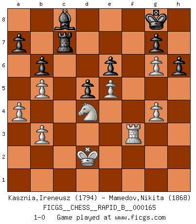 Last move : 1-0 2011 January 30 15:54:25 [Event "FICGS__CHESS__RAPID_B__000165"] [Site "FICGS"] [Date "2010.11.19"] [Round "1"] [White "Kasznia,Ireneusz"] [Black "Mamedov,Nikita"] [Result "1-0"] [WhiteElo "1794"] [BlackElo "1868"] 1.d4 Nf6 2.c4 e6 3.Nc3 Bb4 4.Qb3 c5 5.dxc5 Bxc5 6.Nf3 Nc6 7.Bg5 h6 8.Bxf6 Qxf6 9.Ne4 Qf5 10.Nxc5 Qxc5 11.Rd1 O-O 12.Qb5 Qxb5 13.cxb5 Ne7 14.e4 d5 15.Bd3 Rd8 16.e5 Bd7 17.Kd2 Rac8 18.Nd4 f5 19.h4 Ng6 20.Rde1 Nf4 21.Bf1 b6 22.g3 Ng6 23.h5 Ne7 24.Bd3 Kf7 25.f3 Rf8 26.g4 fxg4 27.fxg4 Kg8 28.Rhf1 Rxf1 29.Rxf1 Rc7 30.a3 Rc8 31.b3 Rd8 32.Ke2 Rc8 33.a4 Rc7 34.Ke3 Rc3 35.Kd2 Rc7 36.Bg6 Nxg6 37.hxg6 Bc8 38.Rf3 1-0 Nimzo-Indian : Spielmann variation Kingside Castling by player Black (move 11) Player White won this chess game. Follow this game move after move (download)Don't even mention losing to me. I can't stand to think of it. (Bobby Fischer) Ich habe kein Problem mit Frauen, sondern nur mit dem Niveau ihres Schachspiels (Judith Polgar) Un Peón pasado es un criminal, quién debe ser mantenido bajo candado y llave. Leves medidas, tales como vigilancia policiaca, no son suficientes. (Aaron Nimzovich) Ce qui caractérise les parties de combat, c'est que si le défenseur a constamment de difficiles problèmes à résoudre, l'attaquant doit chercher sans relâche de nouvelles possibilités d'attaque. (Koblentz) Nobody is always a winner, and anybody who says he is, is either a liar or doesn't play poker. (Amarillo Slim)