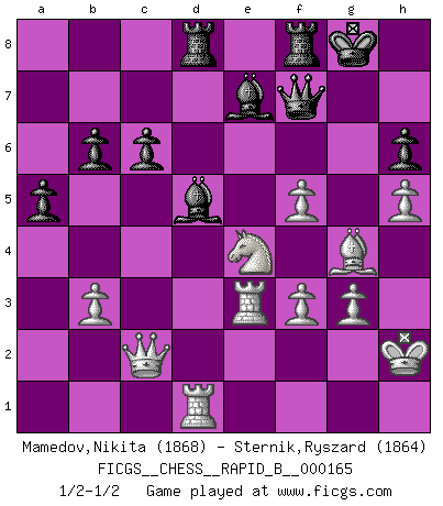 Last move : 1/2-1/2 2011 January 25 7:20:25 [Event "FICGS__CHESS__RAPID_B__000165"] [Site "FICGS"] [Date "2010.11.19"] [Round "1"] [White "Mamedov,Nikita"] [Black "Sternik,Ryszard"] [Result "1/2-1/2"] [WhiteElo "1868"] [BlackElo "1864"] 1.d4 f5 2.c4 e6 3.g3 Nf6 4.Bg2 c6 5.Nf3 d5 6.O-O Bd6 7.b3 O-O 8.Bg5 Nbd7 9.Nc3 Qe8 10.e3 Ne4 11.Rc1 Ba3 12.Rc2 dxc4 13.Nxe4 fxe4 14.Nd2 cxb3 15.axb3 a5 16.Nxe4 h6 17.Bf4 e5 18.dxe5 g5 19.e6 gxf4 20.exd7 Qxd7 21.Rd2 Qg7 22.exf4 Bg4 23.f3 Be6 24.Rd3 Bb4 25.Qc2 Qf7 26.Rfd1 Bd5 27.Nf2 Qe7 28.Ne4 Rae8 29.Kh1 Qf7 30.Re3 Rd8 31.Bh3 Qg6 32.f5 Qh5 33.Bg4 Qf7 34.h4 Be7 35.Kh2 b6 36.h5 Rfe8 37.Rde1 Rf8 38.Rd1 1/2-1/2 Dutch defense Kingside Castling by player White (move 6) Kingside Castling by player Black (move 7) This chess game ended in a draw. Follow this game move after move (download)Only the player with the initiative has the right to attack. (Wilhelm Steinitz) Mit sehr nachdenklichem Gesicht schreitet Bobby durch den Turniersaal. Was ist passiert?, fragt Lombardy. Ich stehe schlecht, antwortet Fischer. Lombardy: Dann biete doch einfach Remis an. Fischer: So schlecht stehe ich nun auch wieder nicht! (Robert James Fischer) El Ajedrez es la vida. (Bobby Fischer) Les Cavaliers se révèlent fort utiles dans les positions fermées. D'habitude, les Fous sont un peu plus forts que les Cavaliers dans les positions ouvertes. Qu'on le veuille ou non, il restera toujours des exceptions ! Patience, use the Force, think ! (Obi-Wan Kenobi in Star Wars ep.2)