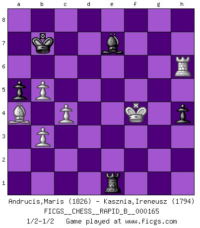 Last move : 1/2-1/2 2010 December 18 13:29:5 [Event "FICGS__CHESS__RAPID_B__000165"] [Site "FICGS"] [Date "2010.11.19"] [Round "1"] [White "Andrucis,Maris"] [Black "Kasznia,Ireneusz"] [Result "1/2-1/2"] [WhiteElo "1826"] [BlackElo "1794"] 1.e4 e5 2.Nf3 Nf6 3.d4 exd4 4.e5 Ne4 5.Qxd4 d5 6.exd6 Nxd6 7.Qf4 Nc6 8.Bd3 Qf6 9.O-O Qxf4 10.Bxf4 h6 11.Re1+ Be6 12.Bxd6 cxd6 13.Nc3 O-O-O 14.Nb5 g5 15.Nfd4 Bd7 16.c3 a6 17.Nxc6 bxc6 18.Nd4 a5 19.Re3 d5 20.Rf3 c5 21.Nb5 Kb8 22.a4 c4 23.Bf5 Be8 24.Re1 Bc5 25.Kf1 Kb7 26.Bc2 Bxb5 27.axb5 Kb6 28.Ba4 Rhf8 29.Rf5 f6 30.Re6+ Rd6 31.Rxd6+ Bxd6 32.Rxd5 Bc5 33.Rd7 f5 34.Rh7 Rf6 35.Rh8 f4 36.Rc8 Re6 37.h3 Rd6 38.Ke2 Re6+ 39.Kf3 Rd6 40.h4 gxh4 41.Kxf4 Bxf2 42.Rxc4 Rd2 43.Rc6+ Kb7 44.b3 Bg3+ 45.Ke3 Rxg2 46.Rxh6 Be1 47.Rh7+ Kb6 48.c4 Bd2+ 49.Kd3 Bg5 50.Kd4 Rd2+ 51.Ke4 Re2+ 52.Kf5 Be7 53.Rh6+ Kb7 54.Kf4 Re1 1/2-1/2 Petrov : Modern attack, Main line Kingside Castling by player White (move 9) Queenside Castling by player Black (move 13) This chess game ended in a draw. Follow this game move after move (download)Tactics flow from a superior position. (Bobby Fischer) Irgendwie scheint mir sonntags früh um 9 Uhr der Killerinstinkt verloren gegangen zu sein. (Alexej Shirov) El Ajedrez es en su esencia, un juego. En su forma, un arte. Y en su ejecución, una ciencia. (Baron Tassilo) Botvinnik disait en comparant les échecs à la musique: Il existe une science dont le but est l'étude de l'acoustique et des sons. Mais il y a aussi un art qui se sert de l'océan des sons : c'est la musique. De toute évidence, il en est de même pour la pensée. La logique est l'étude des lois de la réflexion et les échecs reflètent, en tant qu'art, le côté logique de la réflexion, sous la forme d'images artistiques... Extrait de Fischer - Spassky, Reykjavik 1972 par Alexander & F. Wyndham (Ed. Solar), p 37. Experience is the name we all give to our mistakes. (Oscar Wilde)