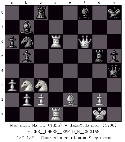 Last move : 1/2-1/2 2010 December 29 21:50:37 [Event "FICGS__CHESS__RAPID_B__000165"] [Site "FICGS"] [Date "2010.11.19"] [Round "1"] [White "Andrucis,Maris"] [Black "Jabot,Daniel"] [Result "1/2-1/2"] [WhiteElo "1826"] [BlackElo "1700"] 1.e4 c5 2.Nc3 d6 3.Nf3 Nf6 4.Bc4 Nc6 5.d4 cxd4 6.Nxd4 Qb6 7.Nb3 e6 8.Be3 Qc7 9.O-O Be7 10.Nb5 Qb8 11.f3 O-O 12.Nc3 a6 13.f4 Qc7 14.Be2 b5 15.Bf3 Bb7 16.Qd2 Nd7 17.Qf2 Bf6 18.Rfd1 Rac8 19.a3 g6 20.Rd3 Be7 21.Rad1 Rfd8 22.R3d2 Bf8 23.h4 h5 24.Be2 Qb8 25.f5 Nce5 26.Bf4 exf5 27.exf5 Re8 28.Qg3 Kh8 29.Rf1 Bg7 30.Qg5 Qc7 31.Rfd1 Bf8 32.fxg6 fxg6 33.Kh1 Nb6 34.Bxe5+ Rxe5 35.Qxg6 Qe7 36.Rxd6 Qxh4+ 37.Kg1 Rg5 38.Qf6+ Kg8 39.Qe6+ Kh8 40.Qf6+ 1/2-1/2 Sicilian : Closed Kingside Castling by player White (move 9) Kingside Castling by player Black (move 11) This chess game ended in a draw. Follow this game move after move (download)Chess is like life. (Boris Spassky) Schach ist ein Teil der Kultur, und wenn es mit der Kultur abwärts geht, geht es auch mit dem Schach abwärts. (Mikhail Moiseyevich Botvinik) El Ajedrez es un expediente tonto que hace creer a la gente inactiva que hacen una cosa muy astuta cuando solamente estan perdiendo su tiempo. (George Bernard Shaw) A chaque perte on perd un peu de soi. (Joël Lautier) After growing wildly for years, the field of computing appears to be reaching its infancy. (John Pierce)