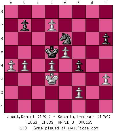 Last move : 1-0 2010 December 5 20:17:21 [Event "FICGS__CHESS__RAPID_B__000165"] [Site "FICGS"] [Date "2010.11.19"] [Round "1"] [White "Jabot,Daniel"] [Black "Kasznia,Ireneusz"] [Result "1-0"] [WhiteElo "1700"] [BlackElo "1794"] 1.e4 e5 2.Nf3 Nf6 3.Nxe5 d6 4.Nf3 Nxe4 5.d4 d5 6.Bd3 Bd6 7.O-O O-O 8.Re1 Nc6 9.c4 Nb4 10.cxd5 Nf6 11.Nc3 Bg4 12.h3 Bh5 13.Bg5 h6 14.Bxf6 Qxf6 15.Be4 Rae8 16.a3 Bxf3 17.Qxf3 Qxf3 18.gxf3 Na6 19.Nb5 g6 20.Nxa7 Bf4 21.Bd3 Rxe1+ 22.Rxe1 Nb8 23.Nb5 Rd8 24.Re4 g5 25.Nc3 Nd7 26.Re2 Nb6 27.Be4 Kg7 28.Rc2 f5 29.Ne2 fxe4 30.Nxf4 gxf4 31.Rxc7+ Rd7 32.Rxd7+ Nxd7 33.fxe4 Nf6 34.d6 Kf7 35.e5 Nd7 36.Kg2 Ke6 37.Kf3 Kf5 38.Ke2 Ke6 39.Kd3 Kd5 40.a4 Nf8 41.b4 Ne6 42.d7 1-0 Petrov : Classical attack, Marshall variation Kingside Castling by player White (move 7) Kingside Castling by player Black (move 7) Player White won this chess game. Follow this game move after move (download)The only thing Chess players have in common is Chess. (Lodewijk Prins) Der Schachmeister von Heute braucht Courage, einen Killerinstinkt, Ausdauer und Arroganz. (Larry Evans) El Rey es una pieza de pelea. ¡Usenlo!. (Wilhelm Steinitz) Je ne suis pas le dernier à jouer lâchement des coups douteux pendant le zeïtnot de l'adversaire pour l'achever: en effet les coups qui font le plus peur sont ceux que l'on ne comprend pas. Je me fais souvent peur quand je joue. (Un professeur anonyme) I don't believe in psychology. I believe in good moves. (Bobby Fischer)