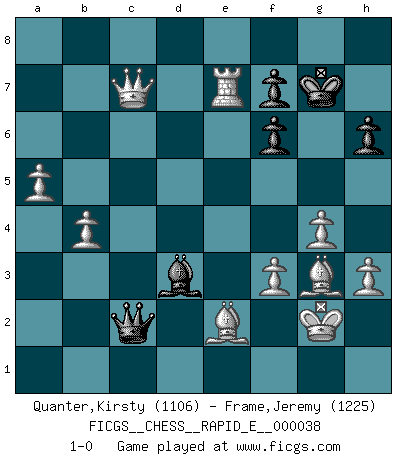 Last move : 1-0 2010 November 27 5:31:22 [Event "FICGS__CHESS__RAPID_E__000038"] [Site "FICGS"] [Date "2010.11.20"] [Round "1"] [White "Quanter,Kirsty"] [Black "Frame,Jeremy"] [Result "1-0"] [WhiteElo "1106"] [BlackElo "1225"] 1.e4 e5 2.d4 exd4 3.Qxd4 Nc6 4.Qd1 Bc5 5.Nf3 d6 6.Bg5 Nf6 7.Nc3 O-O 8.Bd3 h6 9.Bh4 Be6 10.O-O Bg4 11.h3 Bh5 12.g4 Bg6 13.Nd5 Nd4 14.Nxf6+ gxf6 15.Nxd4 Bxd4 16.c3 Bb6 17.Qf3 Kg7 18.a4 a6 19.a5 Ba7 20.Rfe1 Re8 21.Bc4 Qe7 22.e5 dxe5 23.Qxb7 e4 24.Bg3 e3 25.f3 e2 26.Kg2 Qc5 27.Qxa6 Re7 28.Ra2 Rae8 29.b4 Qe3 30.Raxe2 Qxc3 31.Rxe7 Qd2+ 32.R1e2 Qd1 33.Qxa7 Rxe7 34.Rxe7 Qc2+ 35.Be2 Bd3 36.Qxc7 1-0 Centre game Kingside Castling by player Black (move 7) Kingside Castling by player White (move 10) Player White won this chess game. Follow this game move after move (download)A good sacrifice is one that is not necessarily sound but leaves your opponent dazed and confused. (Rudolph Spielmann) Es gibt Leute, die glauben, alles wäre vernünftig, was man mit einem ernsthaften Gesicht tut. (Georg Christoph Lichtenberg) El Ajedrez es una manera fabulosa para que los niños aprendan a autovalorarse y a autoestimarse. (Saudin Robovic) Les échecs sont utiles à l'exercice de la faculté de penser et à celle de l'imagination. Car nous devons posséder une méthode élaborée pour atteindre des buts partout où nous devons conduire notre raison. (Leibnitz) The ego is not master in its own house. (Sigmund Freud)