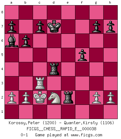 Last move : 0-1 2010 December 3 22:8:45 [Event "FICGS__CHESS__RAPID_E__000038"] [Site "FICGS"] [Date "2010.11.20"] [Round "1"] [White "Korossy,Peter"] [Black "Quanter,Kirsty"] [Result "0-1"] [WhiteElo "1200"] [BlackElo "1106"] 1.e4 e5 2.Nf3 Nc6 3.c3 d5 4.Be2 dxe4 5.Ng1 Nf6 6.d3 exd3 7.Bxd3 Qd5 8.Nf3 e4 9.Bxe4 Qxe4+ 10.Qe2 Qxe2+ 11.Kxe2 b6 12.Re1 Ba6+ 13.Kd1 Be7 14.Bf4 O-O-O 15.Nbd2 Ng4 16.Be3 Nxe3+ 17.Rxe3 Bc5 18.Re1 Bxf2 19.Re4 f5 20.Re6 Kd7 21.Ne5+ Kxe6 22.Nxc6 Rd6 23.Nd4+ Bxd4 24.cxd4 Rxd4 25.Rc1 Kd7 26.Rc3 Re8 27.Kc1 Re1+ 28.Kc2 Re2 0-1 Ponziani Opening Queenside Castling by player Black (move 14) Player Black won this chess game. Follow this game move after move (download)If Chess is a science, it's a most inexact one. If Chess is an art, it is too exacting to be seen as one. If Chess is a sport, it's too esoteric. If Chess is a game, it's too demanding to be just a game. If Chess is a mistress, she's a demanding one. If Chess is a passion, it's a rewarding one. If Chess is life, it's a sad one. (Unknown) Man wirke der falschen Auffassung entgegen, als ob jeder Zug Unmittelbares zu leisten habe; auch Werte- und Ruhezüge haben ihre Existenzberechtigung. (Aaron Nimzowitsch) No puedes jugar al Ajedrez si eres de corazón noble. (Proverbio Francés) On est toujours la mazette de quelqu'un d'autre. (Anonyme) I've never seen so many men wasted so badly. (Blondie in The Good, The Bad and The Ugly)
