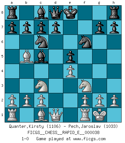 Last move : 1-0 2011 January 1 11:6:34 [Event "FICGS__CHESS__RAPID_E__000038"] [Site "FICGS"] [Date "2010.11.20"] [Round "1"] [White "Quanter,Kirsty"] [Black "Pech,Jaroslav"] [Result "1-0"] [WhiteElo "1106"] [BlackElo "1033"] 1.e4 e5 2.Nf3 Nc6 3.Bb5 f5 4.d3 fxe4 5.dxe4 Nf6 6.O-O Bc5 7.Nc3 1-0 This chess game has been lost on time (started : 2010.11.20 10:6:42) Ruy Lopez : Schliemann defense Kingside Castling by player White (move 6) Player White won this chess game. Follow this game move after move (download)Many Chess players were surprised when after the game, Fischer quietly explained: 'I had already analyzed this possibility' in a position which I thought was not possible to foresee from the opening. (Mikhail Tal) Die größte Kunst beim Schach besteht darin dem Gegner nicht zu zeigen was er tun kann. (Garry Kasparov) La maestría del Ajedrez consiste esencialmente en analizar posiciónes de Ajedrez con precisión. (Mikhail Botvinnik) Les pièces de l'échiquier étaient impitoyables. Elles le retenaient, elles l'absorbaient. Il y avait de l'horreur en cela, mais aussi une harmonie unique. Car, qu'y a-t-il dans le monde, à part les échecs ? (V. Nabokov) The ultimate in disposing one's troops is to be without ascertainable shape. Then the most penetrating spies cannot pry in nor can the wise lay plans against you. (Sun Tzu)