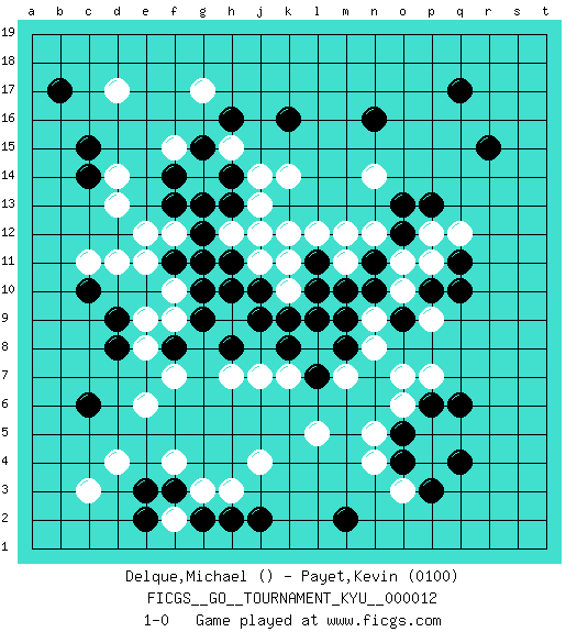Last move : 1-0 2007 February 5 12:37:45 [Event "FICGS__GO__TOURNAMENT_KYU__000012"] [Site "FICGS"] [Date "2006.11.29"] [Round "1"] [Black "Delque,Michael"] [White "Payet,Kevin"] [Result "1-0"] [Rating 2 "0100"] 1.q17 d4 2.r15 d17 3.q4 o3 4.o4 n4 5.o5 j4 6.k16 c11 7.q10 n5 8.p3 o6 9.p6 o7 10.c15 g17 11.b17 d14 12.c14 d13 13.d9 f10 14.c6 e6 15.f3 c3 16.j2 h3 17.h2 g3 18.g2 f2 19.e2 f4 20.e3 p7 21.q6 p11 22.o9 p9 23.p10 o10 24.n10 o11 25.l9 n9 26.m9 n8 27.j9 k14 28.n16 n14 29.g9 f9 30.c10 d11 31.q11 g14 32.l7 l5 33.m2 j7 34.k8 k10 35.j10 j11 36.n11 n12 37.o12 p12 38.o13 m12 39.l11 k11 40.l10 m11 41.m10 l12 42.p13 q12 43.h8 h7 44.g10 g11 45.f8 e8 46.d8 e9 47.h10 f7 48.m8 m7 49.k9 k7 50.h11 h12 51.g12 f12 52.j12 k12 53.h13 j13 54.f11 e11 55.h14 h12 56.g13 j12 57.g11 h15 58.g15 j14 59.f13 e12 60.f14 f15 61.h16 1-0 Here are the names of the openings (joseki) played in the four corners : Corner q4 : q4 o3 Hoshi (Hwajeom, Seongjeom, Xingwei`) 4-4 Point. The star or hoshi (4-4) point, emphasizing influence at the potential expense of territory. Ikken Kakari (Hankan Keolch'im, Yi Gua`jiao~, 1-Space Low Approach). White 2 is the standard approach move to the 4-4. Player Black won this Go (weiqi, baduk) game. Follow this game move after move (download)The second line is the line of defeat, the third line is the line of territory, and the fourth line is the line of influence. (Anonymous) Faith : not wanting to know what is true. (Friedrich Nietzsche)