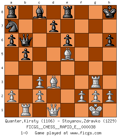 Last move : 1-0 2010 December 11 20:28:58 [Event "FICGS__CHESS__RAPID_E__000038"] [Site "FICGS"] [Date "2010.11.20"] [Round "1"] [White "Quanter,Kirsty"] [Black "Stoyanov,Zdravko"] [Result "1-0"] [WhiteElo "1106"] [BlackElo "1229"] 1.e4 c5 2.Nc3 a6 3.d4 cxd4 4.Qxd4 Nc6 5.Qd1 e6 6.Nf3 Bb4 7.Bd3 Bxc3+ 8.bxc3 h6 9.O-O Qf6 10.Rb1 Nge7 11.Ba3 O-O 12.e5 Nxe5 13.Nxe5 Re8 14.Re1 Nc6 15.Bd6 Na7 16.Re3 b5 17.Rf3 Qd8 18.Nxf7 Qb6 19.Nxh6+ gxh6 20.Rg3+ Kh8 21.Be5+ 1-0 Sicilian : Closed Kingside Castling by player White (move 9) Kingside Castling by player Black (move 11) Player White won this chess game. Follow this game move after move (download)It's just you and your opponent at the board and you're trying to prove something. (Bobby Fischer) Ich war schon mal beim Dopingtest. Da musste ich Urin abgeben, während Dritte zusahen. (Elisabeth Pähtz) Con o sin el título, Bobby Fischer fue sin lugar a dudas el mas grande jugador de su época. (Burt Hochberg) La solitude du joueur d'Echecs à l'approche du mat est semblable à celle du condamné. (Francis Szpiner) Watch your thoughts; they become words. Watch your words; they become actions. Watch your actions; they become habits. Watch your habits; they become character. Watch your character; it becomes your destiny. (Frank Outlaw)