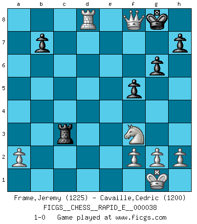 Last move : 1-0 2010 December 4 17:23:1 [Event "FICGS__CHESS__RAPID_E__000038"] [Site "FICGS"] [Date "2010.11.20"] [Round "1"] [White "Frame,Jeremy"] [Black "Cavaille,Cedric"] [Result "1-0"] [WhiteElo "1225"] [BlackElo "1200"] 1.e4 Nf6 2.e5 Nh5 3.Qxh5 g6 4.Qd1 Bg7 5.d4 d6 6.exd6 Qxd6 7.Nf3 c5 8.c3 cxd4 9.cxd4 Nc6 10.Be3 Bf5 11.Bb5 O-O 12.Nc3 Nb4 13.O-O Bd3 14.Bxd3 Nxd3 15.Qxd3 Rfd8 16.Rad1 e5 17.d5 f5 18.Bg5 e4 19.Be7 exd3 20.Bxd6 Rxd6 21.Rxd3 a5 22.Re1 a4 23.Re6 Rxe6 24.dxe6 a3 25.bxa3 Rxa3 26.Rd8+ Bf8 27.e7 Rxc3 28.exf8Q+ 1-0 Alekhine's defense Kingside Castling by player Black (move 11) Kingside Castling by player White (move 13) Promotion Queen by player White (move 28) Player White won this chess game. Follow this game move after move (download)I feel as if I were a piece in a game of Chess, when my opponent says of it: That piece cannot be moved. (Soren Kierkegaard) Ich tröste mich mit dem Vergnügen, daß Schachfans, Zuschauer und Leser glücklich sind, wenn ein Großmeister etwas riskiert, statt nur Klötzchen zu schieben. (Mikhail Nekhemyevich Tal) Aquel que ve no otra dirección en el juego que la de dar Jaque Mate a su oponente, nunca será un buen jugador de Ajedrez. (Euwe) Il n'y a pas de prix trop élevé au scalp de l'ennemi. (Koblentz) We're missing something. (Gregory House, House M.D.)