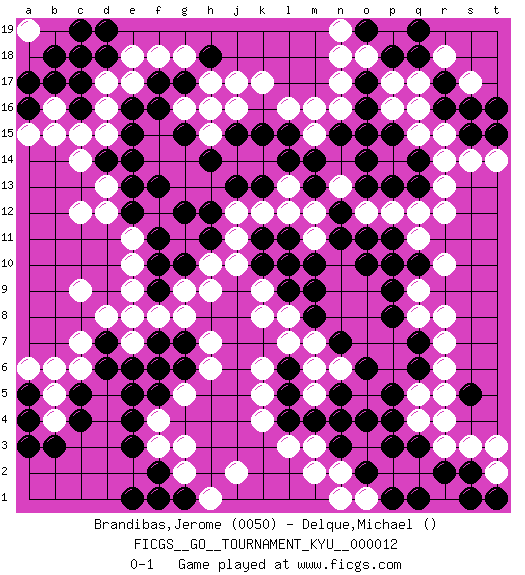Last move : 0-1 2007 January 11 0:19:42 [Event "FICGS__GO__TOURNAMENT_KYU__000012"] [Site "FICGS"] [Date "2006.11.29"] [Round "1"] [Black "Brandibas,Jerome"] [White "Delque,Michael"] [Result "0-1"] [Rating 1 "0050"] 1.e5 d16 2.e15 q4 3.p5 q15 4.p15 p16 5.o16 p17 6.r16 q16 7.r17 p14 8.o15 r15 9.s15 s14 10.t16 r13 11.q18 q8 12.q13 q12 13.p13 p12 14.o13 k4 15.q14 r14 16.q10 p10 17.p9 r10 18.p11 q11 19.o10 q9 20.p10 k6 21.l5 k5 22.c17 d17 23.e16 c15 24.d18 e18 25.c18 e17 26.c16 d15 27.f17 k17 28.k15 j11 29.k10 d12 30.d14 c14 31.e13 c12 32.n5 q5 33.q3 r3 34.p3 h9 35.g10 h10 36.h11 k8 37.k11 j10 38.g12 j12 39.q6 r6 40.q7 r7 41.p8 r8 42.r2 s3 43.q1 f3 44.e3 f4 45.f5 l3 46.m4 c6 47.c5 d8 48.d6 c7 49.f2 g2 50.e1 n17 51.o17 f18 52.g17 g18 53.h18 h17 54.h16 j17 55.j13 k12 56.k13 l12 57.l9 o18 58.p18 n18 59.o19 n16 60.n15 e10 61.f11 e11 62.e12 f8 63.h12 m7 64.f10 g9 65.f13 n2 66.n3 m2 67.o2 g5 68.e4 g3 69.g6 h6 70.g7 h7 71.f7 e7 72.e6 g8 73.f6 l8 74.m9 b5 75.c4 b4 76.d7 e8 77.b3 l16 78.l15 o12 79.n12 n13 80.o14 m12 81.n11 m15 82.m14 m16 83.m13 j16 84.j15 g16 85.f16 h15 86.g15 h16 87.h14 d13 88.e14 b16 89.b17 a15 90.a4 b6 91.a5 a6 92.a3 c9 93.a17 b19 94.d19 a18 95.b18 a19 96.c19 a19 97.s2 t2 98.p4 r4 99.s1 k9 100.m10 n19 101.t1 t3 102.s5 r5 103.g1 h1 104.f1 j2 105.n7 t14 106.t15 p19 107.q19 q17 108.o11 r12 109.m8 m6 110.l6 l7 111.l4 m3 112.o19 s17 113.s16 r18 114.a16 b15 115.f9 e9 116.l11 m11 117.l10 o1 118.p1 n1 119.o4 n6 120.o6 l13 121.l14 m5 122.n4 pass 0-1 Here are the names of the openings (joseki) played in the four corners : Corner d16 : d16 e15 Hoshi (Hwajeom, Seongjeom, Xingwei`) 4-4 Point. The star or hoshi (4-4) point, emphasizing influence at the potential expense of territory. Corner q4 : q4 p5 Hoshi (Hwajeom, Seongjeom, Xingwei`) 4-4 Point. The star or hoshi (4-4) point, emphasizing influence at the potential expense of territory. Corner q16 : q15 p15 Takamoku (Gomok, Gaomu`) 5-4 Point. The takamoku (high) point (5-4). With its emphasis on influence, the 5-4 point complements the 4-4 (hoshi) point in creating an influence-oriented fuseki. Corner d4 : e5 h9 Go-no-go (Wu~wu~) 5-5 Point. The 5-5 was experimented with briefly during the "New Fuseki" movement in Japan in the 1930s. The 5-5 point has not retained popularity because the 4-4 hoshi (star) point strikes a better balance between influence and territory. As one can see from the variations, though, the 5-5 is playable. Player White won this Go (weiqi, baduk) game. Follow this game move after move (download)In the sound of the stone you can hear its purpose. (Pierre Audouard) A cynic is a man who knows the price of everything but the value of nothing. (Oscar Wilde)
