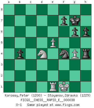 Last move : 0-1 2011 January 3 10:54:32 [Event "FICGS__CHESS__RAPID_E__000038"] [Site "FICGS"] [Date "2010.11.20"] [Round "1"] [White "Korossy,Peter"] [Black "Stoyanov,Zdravko"] [Result "0-1"] [WhiteElo "1200"] [BlackElo "1229"] 1.e4 c5 2.c3 a6 3.d4 cxd4 4.cxd4 e6 5.Bd3 Bb4+ 6.Bd2 Bxd2+ 7.Nxd2 Nc6 8.Ngf3 Nge7 9.O-O Nb4 10.Bc4 O-O 11.a3 Nbc6 12.Qc2 d5 13.exd5 exd5 14.Bd3 h6 15.b4 g6 16.g3 Bh3 17.Rfe1 Qd7 18.Ne5 Nxe5 19.dxe5 b5 20.f4 d4 21.Ne4 Nd5 22.Nf2 Rfc8 23.Qb2 Rc3 24.Rec1 Bf5 25.Be4 Bxe4 26.Nxe4 Rxc1+ 27.Rxc1 Qa7 28.Nc5 Nc3 29.Nd3 a5 30.Kf1 axb4 31.Nxb4 Qxa3 32.Qxa3 Rxa3 33.Nc2 Ra4 34.Nxd4 b4 35.Nc6 Nd5 36.Nd4 Ne3+ 37.Ke1 Ra2 38.h3 Kg7 39.g4 Ng2+ 40.Kf1 Nxf4 41.h4 Rh2 42.Re1 Rxh4 0-1 Sicilian : Alapin's variation (2.c3) Kingside Castling by player White (move 9) Kingside Castling by player Black (move 10) Player Black won this chess game. Follow this game move after move (download)Chess books should be used as we use glasses: to assist the sight, although some players make use of them as if they thought they conferred sight. (Jose Raul Capablanca) Wenn Du einsam bist, wenn Du Dich in der Welt wie ein Fremder fühlst, spiele Schach. Das wird Deinen Geist erheben und Dein Ratgeber im Kampf sein. (Aristoteles) Siempre es mucho mejor sacrificar las piezas de tu oponente. (Savielly Tartakover) Les échecs sont plus proches de l'art de l'assassinat que de l'art de la guerre. (Arturo Perez-Reverte) When you've done things right people won't know you've done anything at all. (Futurama)