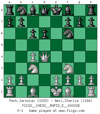 Last move : 0-1 2011 January 8 4:31:51 [Event "FICGS__CHESS__RAPID_E__000038"] [Site "FICGS"] [Date "2010.11.20"] [Round "1"] [White "Pech,Jaroslav"] [Black "Neil,Charlie"] [Result "0-1"] [WhiteElo "1033"] [BlackElo "1166"] 1.c4 e5 2.Nc3 c6 3.Nf3 d6 4.d4 exd4 5.Qxd4 Nf6 0-1 English Opening Player Black won this chess game. Follow this game move after move (download)A Chess game is a dialogue, a conversation between a player and his opponent. Each move by the opponent may contain threats or be a blunder, but a player cannot defend against threats or take advantage of blunders if he does not first ask himself: What is my opponent planning after each move ? (Bruce A. Moon) In Buenos Aires ist es nicht mein vorrangiges Ziel ein starkes Turnier zu organisieren, sondern ein Turnier für Gentlemen. Ich würde nie Kamsky einladen. Ich mag keine Probleme. (Miguel Najdorf) No nos podemos resistir a la fascinación de un sacrificio ya que la pasión por los sacrificios es parte de la naturaleza de un jugador de Ajedrez. (Rudolf Spielman) Les échecs sont un jeu terrible. Si vous n'avez pas le centre, votre adversaire a une position plus libre. Par contre, si vous avez le centre, alors vous avez vraiment quelque chose pour laquelle vous inquiéter ! (Siegbert Tarrasch) Wikichess, chess moves explained by 'experimented' players. (Thibault de Vassal)
