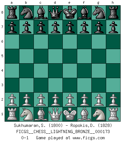 Last move : 0-1 2010 November 22 10:39:1 [Event "FICGS__CHESS__LIGHTNING_BRONZE__000173"] [Site "FICGS"] [Date "2010.11.22"] [Round "1"] [White "Sukhumaran,Suraj"] [Black "Ropokis,Dimitrios"] [Result "0-1"] [WhiteElo "1800"] [BlackElo "1828"] 0-1 This chess game has been lost on time (started : 2010.11.22 7:4:57) Player Black won this chess game. Follow this game move after move (download)Adequate compensation for a sacrifice is having a sound combination leading to a winning position; adequate compensation for a blunder is having your opponent snatch defeat from the jaws of victory. (Bruce A. Moon) Über die Verhaftung Bobby Fischers: Warum es die Bush-Administration für nötig befindet einen 61 Jahre alten Mann zu hetzten, der für niemanden ausser sich selbste eine Gefahr darstellt ist ein Rätsel. (Nigel Short) La esencia del Ajedrez es pensar acerca de lo que el Ajedrez es. (David Bronstein) Tout change constamment, y compris dans le monde des Echecs. (Botvinnik) Faith : not wanting to know what is true. (Friedrich Nietzsche)