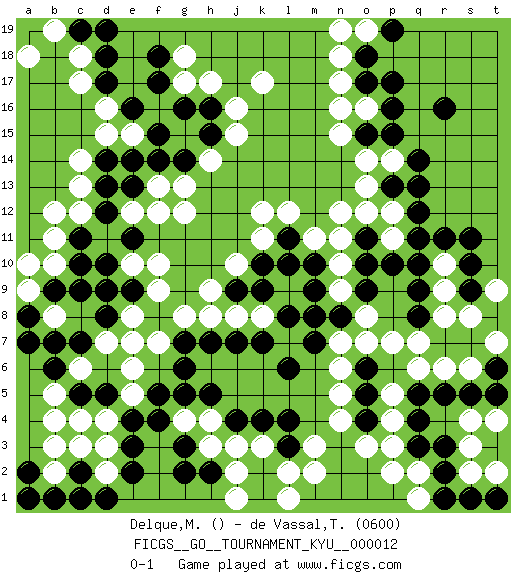 Last move : 0-1 2007 April 13 9:28:23 [Event "FICGS__GO__TOURNAMENT_KYU__000012"] [Site "FICGS"] [Date "2006.11.29"] [Round "1"] [Black "Delque,Michael"] [White "de Vassal,Thibault"] [Result "0-1"] [Rating 2 "0600"] 1.r16 d16 2.p17 d4 3.q4 o3 4.o4 n4 5.o5 p3 6.q3 k3 7.q10 k17 8.d10 c12 9.c7 n17 10.f17 h17 11.d17 c17 12.d18 c18 13.e16 d15 14.f14 r6 15.r5 q6 16.q8 p7 17.o9 n7 18.f4 b5 19.j4 m2 20.e3 d3 21.c5 c4 22.d5 j3 23.k4 n5 24.o6 o7 25.s5 n6 26.k7 e5 27.e4 e6 28.b6 b4 29.g6 d7 30.d8 e8 31.c9 c6 32.a7 h4 33.g5 q2 34.r2 q1 35.r1 p2 36.q13 g4 37.g3 h3 38.f5 f10 39.e9 f9 40.h5 b8 41.b7 h14 42.f15 b10 43.c11 b11 44.d12 c13 45.e13 o16 46.e2 o14 47.p15 n12 48.h15 j15 49.h16 j16 50.b1 h8 51.k9 k12 52.g2 j10 53.f8 e7 54.k1 l1 55.k2 j2 56.l3 l2 57.l4 g12 58.b9 f7 59.g7 g8 60.o18 n18 61.l11 l12 62.m9 s6 63.t5 g17 64.f18 g18 65.g16 s8 66.s10 p4 67.q5 p5 68.l6 m11 69.l10 e10 70.d9 e12 71.e11 f12 72.d13 f13 73.d14 c14 74.p16 p12 75.q12 p14 76.q14 p11 77.q11 d2 78.d1 a9 79.a8 a10 80.c10 b12 81.g14 g13 82.h7 j8 83.j7 b2 84.c1 r9 85.q9 r10 86.r11 o19 87.p19 n19 88.o15 n15 89.o17 n16 90.c2 c3 91.a2 b3 92.a1 m3 93.c19 b19 94.d19 a18 95.p13 o13 96.s9 r8 97.h2 j1 98.j9 h9 99.p10 t9 100.s11 k8 101.l8 n10 102.t6 t7 103.o11 o12 104.k10 k11 105.o10 q7 106.m10 n9 107.n8 n11 108.m7 e15 109.e14 o8 110.m8 s3 111.r3 s4 112.t3 s2 113.s1 t2 114.t1 t4 0-1 Here are the names of the openings (joseki) played in the four corners : Corner q4 : q4 o3 Hoshi (Hwajeom, Seongjeom, Xingwei`) 4-4 Point. The star or hoshi (4-4) point, emphasizing influence at the potential expense of territory. Ikken Kakari (Hankan Keolch'im, Yi Gua`jiao~, 1-Space Low Approach). White 2 is the standard approach move to the 4-4. Corner d4 : d4 c7 Hoshi (Hwajeom, Seongjeom, Xingwei`) 4-4 Point. The star or hoshi (4-4) point, emphasizing influence at the potential expense of territory. Nikken Kakari (Dukan Keolch'im, E`r Gua`jiao~, 2-Space Low Approach). White typically answers by 7-3 or 3-5 (which is not joseki). Player White won this Go (weiqi, baduk) game. Follow this game move after move (download)The carpenter's square becomes ko. (Anonymous) Experiences are the keys to life. (Daniel Parmet)
