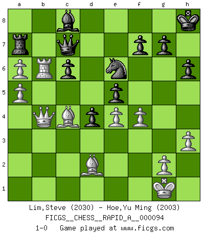 Last move : 1-0 2011 January 16 1:19:35 [Event "FICGS__CHESS__RAPID_A__000094"] [Site "FICGS"] [Date "2010.11.23"] [Round "1"] [White "Lim,Steve"] [Black "Hoe,Yu Ming"] [Result "1-0"] [WhiteElo "2030"] [BlackElo "2003"] 1.e4 c5 2.Nf3 e6 3.Nc3 Nc6 4.d4 cxd4 5.Nxd4 a6 6.Nxc6 bxc6 7.Bd3 d5 8.O-O Nf6 9.Qf3 Bb7 10.Bf4 Be7 11.Rfe1 O-O 12.h3 Re8 13.Rab1 Nd7 14.Na4 Rc8 15.b3 e5 16.Bd2 Qc7 17.Rbd1 Nf6 18.c4 d4 19.c5 a5 20.Nb6 Rb8 21.Rc1 Bxc5 22.Rxc5 Qxb6 23.Rxa5 Ra8 24.b4 Rxa5 25.bxa5 Qa7 26.Qe2 Ra8 27.Rb1 Bc8 28.Rb6 Qc7 29.Bc4 Kh8 30.Qd3 h6 31.a4 Ra7 32.f3 Kh7 33.Qb3 Kh8 34.a6 Nd7 35.a5 Nc5 36.Qb4 Ne6 37.f4 1-0 Sicilian defense Kingside Castling by player White (move 8) Kingside Castling by player Black (move 11) Player White won this chess game. Follow this game move after move (download)He who fears an isolated Queen's Pawn should give up Chess. (Siegbert Tarrasch) Es tut gut, die Entwicklungsperiode von, [...] demokratischem Geist durchdringen zu lassen. Wie undemokratisch wäre es doch beispielsweise, den einen Offizier große Spaziertouren vornehmen zu lassen, während die anderen zu Hause säßen und sich entsetzlich langweilten. (Aaron Nimzowitsch) Debes de llevar a tu oponente hacia un profundo y obscuro bosque donde 2+2=5, y el camino que conduce a la salida es suficientemente ancho para solamente uno. (Mikhail Tal) Il s'avisa de me proposer d'apprendre les échecs qu'il jouait un peu... me voilà forcené des échecs. J'achète un échiquier, je m'enferme dans ma chambre, j'y passe des jours et des nuits à vouloir apprendre par cur toutes les parties. (Jean-Jacques Rousseau, Confessions) Whoever said the pen is mightier than the sword obviously never encountered automatic weapons. (US General Douglas MacArthur)