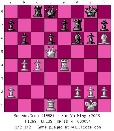 Last move : 1/2-1/2 2011 February 1 8:58:59 [Event "FICGS__CHESS__RAPID_A__000094"] [Site "FICGS"] [Date "2010.11.23"] [Round "1"] [White "Maceda,Coco"] [Black "Hoe,Yu Ming"] [Result "1/2-1/2"] [WhiteElo "1982"] [BlackElo "2003"] 1.e4 c5 2.Nf3 Nc6 3.d4 cxd4 4.Nxd4 g6 5.c4 Bg7 6.Be3 Nh6 7.Be2 d6 8.Nc3 O-O 9.O-O f5 10.exf5 Bxd4 11.Bxh6 Rxf5 12.Rc1 Rf7 13.Bf3 Be5 14.Re1 Nd4 15.Be4 Bd7 16.Qd2 Bc6 17.b4 Rc8 18.Ne2 Nxe2+ 19.Rxe2 Bxe4 20.Rxe4 Bf6 21.Rd1 b6 22.Qd5 1/2-1/2 Sicilian : Accelerated Fianchetto, Maroczy bind, 6.Be3 Kingside Castling by player Black (move 8) Kingside Castling by player White (move 9) This chess game ended in a draw. Follow this game move after move (download)Castle early and often. (Rob Sillars) Frage: Wie viele Autos haben Sie schon zerstört? - Antwort: Nur zwei. (Loek van Wely) Los problemas de Ajedrez exigen del compositor las mismas virtudes que caracterizan todo el arte de valor: originalidad, invención, concisión, armonía, complejidad e insinceridad explendida. (Vladimir Nabokov) C'est la seule position que je connaisse où les deux camps sont mals. Propos prêtés à V. Anand. 'preceded by its own quotation yields a falsehood' preceded by its own quotation yields a falsehood. (W. V. O. Quine - Set Theory And Its Logic, 1953)