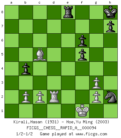 Last move : 1/2-1/2 2011 January 9 22:26:13 [Event "FICGS__CHESS__RAPID_A__000094"] [Site "FICGS"] [Date "2010.11.23"] [Round "1"] [White "Kirali,Hasan"] [Black "Hoe,Yu Ming"] [Result "1/2-1/2"] [WhiteElo "1931"] [BlackElo "2003"] 1.e4 c5 2.Nf3 d6 3.d4 cxd4 4.Nxd4 Nf6 5.Nc3 a6 6.Be3 e6 7.Be2 Qc7 8.f4 Be7 9.O-O Nc6 10.Qe1 O-O 11.Rd1 Bd7 12.Qg3 Nxd4 13.Bxd4 Bc6 14.Bf3 Rad8 15.a3 b5 16.Kh1 a5 17.Rfe1 Kh8 18.e5 dxe5 19.fxe5 Nd7 20.Ne4 b4 21.axb4 axb4 22.Rd2 Bxe4 23.Bxe4 f5 24.exf6 Qxg3 25.hxg3 gxf6 26.Bf5 exf5 27.Rxe7 Ne5 28.Kg1 Ng4 29.Kf1 Rfe8 30.Rxe8+ Rxe8 31.Bc5 Nh2+ 1/2-1/2 Sicilian : Najdorf, Byrne (English) attack Kingside Castling by player White (move 9) Kingside Castling by player Black (move 10) This chess game ended in a draw. Follow this game move after move (download)Chess is a forcing house where the fruits of character can ripen more fully than in life. (Edward Morgan Foster) Über Kasparov: Es ist offensichtlich, daß er in einem totalitären Staat aufwuchs und deshalb zu diktatorischen Zügen neigt. (Viktor Kortschnoi) Hoy en día, si tu no eres un Gran Maestro a los 14 años, es mejor que lo olvides. (Anand Viswanathan) Les échecs sont un jeu par leur forme, un art par leur essence et une science par sa difficulté d'acquisition. Ils peuvent vous procurer autant de plaisir qu'un bon livre ou une belle musique, mais vous n'aurez une réelle joie que si vous arrivez à bien jouer. (Tigran Petrosian) He is a liar. I just don't know what the lie is yet. (Horatio Caine, C.S.I. Miami)