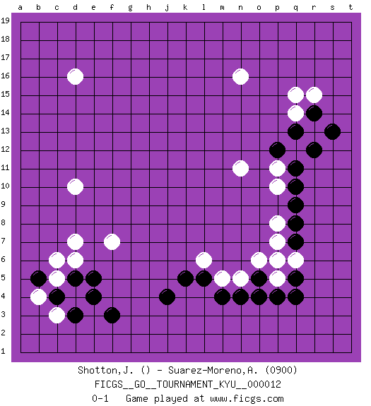 Last move : 0-1 2007 February 10 21:46:40 [Event "FICGS__GO__TOURNAMENT_KYU__000012 "] [Site "FICGS"] [Date "2006.11.29"] [Round "1"] [Black "Shotton,Jack "] [White "Suarez-Moreno,Alejandro "] [Result "0-1"] [Rating 2 "0900"] 1.d3 d16 2.q4 q15 3.q13 c5 4.e5 d4 5.e4 c3 6.f3 d7 7.j4 q6 8.q7 p5 9.p4 n5 10.o5 o6 11.o4 p7 12.q8 p8 13.q9 n16 14.n4 m5 15.m4 f7 16.l5 l6 17.k5 p11 18.q11 p10 19.q10 r13 20.r12 d10 21.r14 q14 22.s13 r15 23.d5 d6 24.c4 b4 25.p12 n11 26.q5 p6 27.b5 c6 0-1 This go game has been lost on time (started : 2006.11.29 15:20:31) Here are the names of the openings (joseki) played in the four corners : Corner q16 : q15 q13Takamoku (Gomok, Gaomu`) 5-4 Point. The takamoku (high) point (5-4). With its emphasis on influence, the 5-4 point complements the 4-4 (hoshi) point in creating an influence-oriented fuseki. Corner d4 : d3 c5Komoku (Somok, Xiao~mu`) 3-4 Point. The komoku (3-4) point is the traditional corner enclosure move..Ikken Kakari (Hankan Keolch'im, Yi Gua`jiao~, 1-Space Low Pincer). The small knight move is the basic approach move to the 3-4 point stone. It has been continually used for over four centuries. There are limitless variations, with new moves constantly being discovered. White 2 opens the door to a treaure store of joseki. Corner q4 : q4 q6Hoshi (Hwajeom, Seongjeom, Xingwei`) 4-4 Point. The star or hoshi (4-4) point, emphasizing influence at the potential expense of territory.Ikken Takagakari (Hankan Nop'dakeolch'im, Yi Gaojia, 1-Space High Approach). Black typically responds at 6-4 or 3-10. Black 4-10 is played when Black finds play on the right side advantageous. Black 4-8 or 3-8 may be played when Black has support at top. Player White won this Go (weiqi, baduk) game.Follow this game move after move (download ) Play slow, win slow; play fast, lose fast. (Anonymous) Treat your password like your toothbrush. Don't let anybody else use it, and get a new one every six months. (Clifford Stoll)