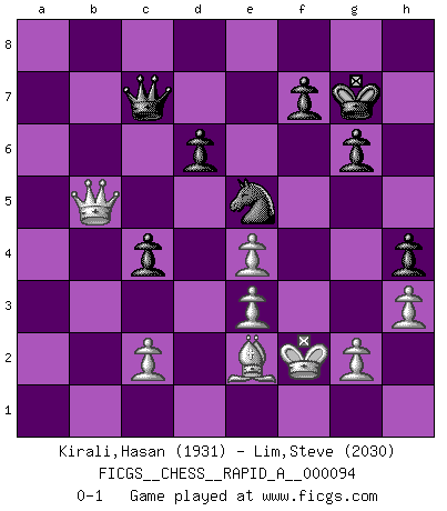 Last move : 0-1 2011 April 6 20:51:43 [Event "FICGS__CHESS__RAPID_A__000094"] [Site "FICGS"] [Date "2010.11.23"] [Round "1"] [White "Kirali,Hasan"] [Black "Lim,Steve"] [Result "0-1"] [WhiteElo "1931"] [BlackElo "2030"] 1.e4 e5 2.d4 exd4 3.Qxd4 Nf6 4.Nf3 Nc6 5.Qa4 Bc5 6.Be2 d6 7.O-O O-O 8.Nc3 h6 9.Be3 Bxe3 10.fxe3 Ng4 11.Bb5 Nce5 12.Qd4 c6 13.Be2 Qe7 14.Rad1 Rd8 15.a4 Be6 16.b3 a6 17.h3 Nxf3+ 18.Bxf3 Ne5 19.Ne2 c5 20.Qa1 b5 21.Nf4 Bd7 22.Be2 Bc6 23.Nd5 Qb7 24.Qc3 bxa4 25.bxa4 Bxa4 26.Rb1 Bb5 27.Qd2 c4 28.Rf2 Rdb8 29.Nc3 Qc6 30.R2f1 a5 31.Rb2 a4 32.Rfb1 a3 33.Ra2 Ra5 34.Kf2 Rba8 35.Qc1 Qa6 36.Rxb5 Rxb5 37.Nxb5 Qxb5 38.Rxa3 Rxa3 39.Qxa3 Qc6 40.Qa5 g6 41.Qd5 Qc7 42.Kf1 h5 43.Qa8+ Kg7 44.Qd5 h4 45.Kf2 Kh6 46.Qb5 Kg7 0-1 Centre game Kingside Castling by player White (move 7) Kingside Castling by player Black (move 7) Player Black won this chess game. Follow this game move after move (download)White lost because he failed to remember the right continuation and had to think up the moves himself. (Siegbert Tarrasch) Kein Schachspieler kann gut schlafen. (H. G. Wells) Los Peones son nacidos libres, y aún así, se encuentran por doquier encadenados. (Rick Kennedy) Les échecs sont un jeu terrible. Si vous n'avez pas le centre, votre adversaire a une position plus libre. Par contre, si vous avez le centre, alors vous avez vraiment quelque chose pour laquelle vous inquiéter ! (Siegbert Tarrasch) Yoga is 99% practice and 1% knowledge. (Sri Krishna Pattabhi Jois)