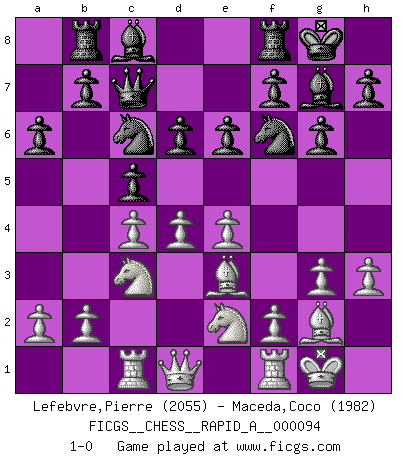 Last move : 1-0 2011 January 12 14:52:31 [Event "FICGS__CHESS__RAPID_A__000094"] [Site "FICGS"] [Date "2010.11.23"] [Round "1"] [White "Lefebvre,Pierre"] [Black "Maceda,Coco"] [Result "1-0"] [WhiteElo "2055"] [BlackElo "1982"] 1.c4 c5 2.Nc3 Nf6 3.g3 Nc6 4.Bg2 g6 5.d3 Bg7 6.e4 d6 7.Nge2 O-O 8.O-O a6 9.h3 Qc7 10.Be3 e6 11.Rc1 Rb8 12.d4 1-0 English : Symmetrical variation Kingside Castling by player Black (move 7) Kingside Castling by player White (move 8) Player White won this chess game. Follow this game move after move (download)We like to think. (Gary Kasparov) Auf Remis zu spielen ist gewissermaßen ein Verbrechen gegen das Schachspiel. (Mikhail Nekhemyevich Tal) El Ajedrez, como cualquier otra actividad creativa, puede existir solo a través de méritos combinados de aquellos que tienen talento creativo y de aquellos que tienen la habilidad de organizar un trabajo creativo. (Mikhail Botvinnik) Il n'y a pas eu de défaite parce que je ne crois pas que cet ordinateur ait jamais existé. IBM a triché en refusant d'imprimer les modes de recherche de la machine. C'est évident, pendant le match, des coups décisifs ont été joués par des êtres humains. Aujourd'hui, les meilleurs spécialistes en informatique ne peuvent toujours pas expliquer comment Deep-Blue a pu jouer contre la logique des ordinateurs. IBM a gagné une guerre de communication, mais ils sont incapables de prouver que l'ordinateur a gagné tout seul. (Garry Kasparov) How many people work in NATO Headquarters ? - About half of them. (Dirk Stikker, NATO general secretary)