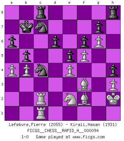 Last move : 1-0 2011 January 4 23:26:55 [Event "FICGS__CHESS__RAPID_A__000094"] [Site "FICGS"] [Date "2010.11.23"] [Round "1"] [White "Lefebvre,Pierre"] [Black "Kirali,Hasan"] [Result "1-0"] [WhiteElo "2055"] [BlackElo "1931"] 1.c4 e5 2.Nc3 Nc6 3.g3 d6 4.Bg2 Be6 5.d3 Qd7 6.e4 Nf6 7.h3 Be7 8.Nge2 O-O-O 9.Qa4 Kb8 10.Be3 h5 11.f4 Qc8 12.Nd5 a6 13.b4 Bd7 14.Nxe7 Nxe7 15.Qa3 Ng6 16.f5 Nf8 17.Rc1 b6 18.c5 Qb7 19.O-O h4 20.cxb6 cxb6 21.g4 Bc6 22.Rc2 N8d7 23.g5 Ne8 24.Qb3 f6 25.Rfc1 Rc8 26.Rc3 Nf8 27.g6 Rc7 28.Bf3 b5 29.Kh2 Rc8 30.Qf7 Nd7 31.d4 Nb6 32.d5 Nc4 33.dxc6 Rxc6 34.Qxb7+ Kxb7 35.a4 Rc8 36.R3c2 Nc7 37.Bf2 1-0 English : Sicilian Reversed Queenside Castling by player Black (move 8) Kingside Castling by player White (move 19) Player White won this chess game. Follow this game move after move (download)Chess mastery essentially consists of analyzing Chess positions accurately. (Mikhail Botvinnik) Wenn Spassky eine Figur opfert kannst du genauso gut aufgeben. Aber wenn Tal eine Figur opfert, spiel weiter. Er könnte noch eine weitere opfern, und dann ... wer weiß? (Miguel Najdorf) Yo tuve un dolor de muelas en la primer partida. En el segundo juego, tuve un dolor de cabeza. En el tercero, tuve un ataque de reumatísmo. En la cuarta partida, no me sentía muy bien. ¿Y en el quinto juego? Bueno, ¿que acaso uno tiene que ganar todos los juegos?. (Siegbert Tarrasch) Les échecs sont utiles à l'exercice de la faculté de penser et à celle de l'imagination. Car nous devons posséder une méthode élaborée pour atteindre des buts partout où nous devons conduire notre raison. (Leibnitz) Hold em is to stud what chess is to checkers. (Johnny Moss)