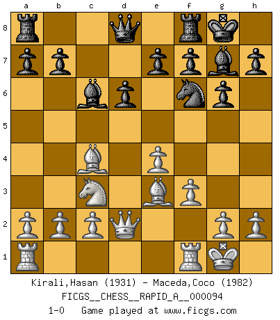 Last move : 1-0 2011 January 9 10:45:22 [Event "FICGS__CHESS__RAPID_A__000094"] [Site "FICGS"] [Date "2010.11.23"] [Round "1"] [White "Kirali,Hasan"] [Black "Maceda,Coco"] [Result "1-0"] [WhiteElo "1931"] [BlackElo "1982"] 1.e4 c5 2.Nf3 d6 3.d4 cxd4 4.Nxd4 Nf6 5.Nc3 g6 6.Be3 Bg7 7.Bc4 O-O 8.f3 Nc6 9.O-O Bd7 10.Nxc6 Bxc6 11.Qd2 1-0 This chess game has been lost on time (started : 2010.11.23 10:16:1) Sicilian : Dragon, 6.Be3 Kingside Castling by player Black (move 7) Kingside Castling by player White (move 9) Player White won this chess game. Follow this game move after move (download)During a Chess competition a Chessmaster should be a combination of a beast of prey and a monk. (Alexander Alekhine) Rauchen ist dem Schachspieler bei seiner Arbeit, also im Wettkampf, untersagt. (Viktor Kortschnoi) El Ajedrez lo es todo: arte, ciencia y deporte. (Anatoly Karpov) La tactique est l'élément le plus important du milieu de jeu. (Siegbert Tarrasch) In every real man a child is hidden that wants to play. (Friedrich Nietzsche)