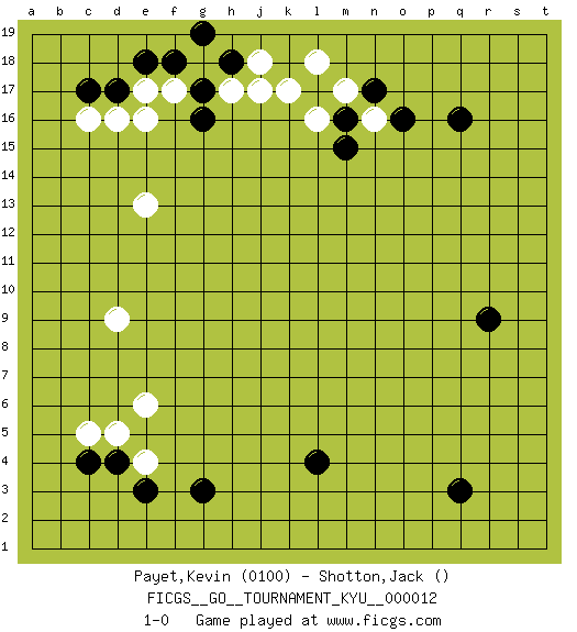 Last move : 1-0 2007 February 21 5:13:46 [Event "FICGS__GO__TOURNAMENT_KYU__000012"] [Site "FICGS"] [Date "2006.11.29"] [Round "1"] [Black "Payet,Kevin"] [White "Shotton,Jack"] [Result "1-0"] [Rating 1 "0100"] 1.q16 e4 2.q3 d16 3.r9 n16 4.g3 d9 5.c4 e6 6.e3 d5 7.d4 c5 8.l4 e13 9.c17 c16 10.d17 e17 11.e18 f17 12.f18 g18 13.g17 h17 14.g16 e16 15.h18 j18 16.g19 j17 17.l17 l16 18.m16 m17 19.m15 l18 20.n17 k17 21.o16 1-0 This go game has been lost on time (started : 2006.11.29 15:20:31) Here are the names of the openings (joseki) played in the four corners : Corner q16 : q16 n16 Hoshi (Hwajeom, Seongjeom, Xingwei`) 4-4 Point. The star or hoshi (4-4) point, emphasizing influence at the potential expense of territory. Nikken Takagakari (Dukan Nop'dakeolch'im, E`r Gaojia, 2-Space High Approach). White 2 is a light approach move. Rarely played in even games, White 2 is typically employed in handicap games. Black continues with 6-4 or 3-10. In Korean Sunjang Baduk Black has a stone on 8-4. Corner d4 : e4 g3 Takamoku (Gomok, Gaomu`) 5-4 Point. The takamoku (high) point (5-4). With its emphasis on influence, the 5-4 point complements the 4-4 (hoshi) point in creating an influence-oriented fuseki. Player Black won this Go (weiqi, baduk) game. Follow this game move after move (download)Win the early ko to win the game. (Anonymous) History is the quarrels of popes and kings, with wars or pestilences in every page; the men all so good for nothing, and hardly any women at all. (Jane Austen)