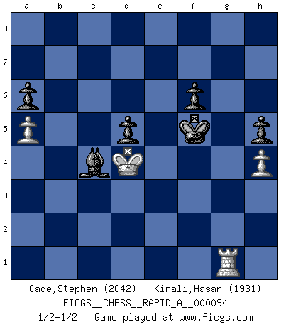 Last move : 1/2-1/2 2011 January 14 15:20:14 [Event "FICGS__CHESS__RAPID_A__000094"] [Site "FICGS"] [Date "2010.11.23"] [Round "1"] [White "Cade,Stephen"] [Black "Kirali,Hasan"] [Result "1/2-1/2"] [WhiteElo "2042"] [BlackElo "1931"] 1.d4 Nf6 2.c4 e6 3.Nc3 d5 4.cxd5 exd5 5.Bg5 c6 6.Qc2 Na6 7.e3 Nc7 8.Bd3 Bd6 9.Nf3 h6 10.Bh4 O-O 11.O-O Re8 12.h3 g5 13.Bg3 Bxg3 14.fxg3 Rxe3 15.Ne5 Be6 16.Qf2 Rxe5 17.dxe5 Nd7 18.Rae1 Qf8 19.Ne2 Nxe5 20.Bb1 Nc4 21.Nd4 Nd6 22.g4 Qg7 23.a4 Re8 24.Re2 Bc8 25.Rfe1 Rxe2 26.Rxe2 Qf8 27.b4 Qd8 28.Qe3 Nce8 29.a5 a6 30.Bf5 Ng7 31.Qe7 Qxe7 32.Rxe7 Kf8 33.Rc7 Ne6 34.Bxe6 Bxe6 35.Nf5 Nxf5 36.gxf5 Bxf5 37.b5 cxb5 38.Rxb7 Bd3 39.Rb6 b4 40.Rxb4 Kg7 41.Kf2 Bc4 42.Ke3 h5 43.g3 Kg6 44.Kd4 f6 45.Rb2 Kf5 46.Rf2+ Ke6 47.h4 gxh4 48.gxh4 Bb5 49.Rg2 Bc4 50.Rg8 Kf5 51.Rg1 1/2-1/2 Queen's pawn game Kingside Castling by player Black (move 10) Kingside Castling by player White (move 11) 10 pieces endgame at move 48 : White KRPP , Black KBPPPP WHITE : King + 1 Rook 2 Pawns BLACK : King + 1 Bishop 4 Pawns This chess game ended in a draw. Follow this game move after move (download)Chess is no whit inferior to the violin, and we have a large number of professional violinists. (Mikhail Botvinnik) Gewöhnliche Menschen denken nur daran, wie sie ihre Zeit verbringen. Ein intelligenter Mensch versucht, sie auszunutzen. (Arthur Schopenhauer) Todo lo que importa ante el tablero de Ajedrez son buenas jugadas. (Bobby Fischer) Le thème de l'attaque double intervient d'une manière ou d'une autre dans l'immense majorité des combinaisons. (Youri Averbakh) The hypothalamus is one of the most important parts of the brain, involved in many kinds of motivation, among other functions. The hypothalamus controls the 'Four Fs: Fighting, Fleeing, Feeding and Mating. (Unknown author)