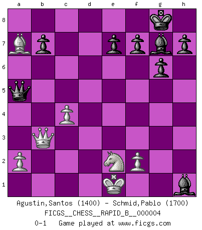 Last move : 0-1 2006 July 10 18:5:58 [Event "FICGS__CHESS__RAPID_B__000004"] [Site "FICGS"] [Date "2006.04.30"] [Round "1"] [White "Agustin,Santos"] [Black "Schmid,Pablo"] [Result "0-1"] [WhiteElo "1400"] [BlackElo "1700"] 1.d4 Nf6 2.Nf3 g6 3.c4 Bg7 4.Nc3 d5 5.cxd5 Nxd5 6.e4 Nxc3 7.bxc3 c5 8.Rb1 O-O 9.Bc4 Qc7 10.Qc2 Nd7 11.Be3 Nb6 12.Bd3 Rd8 13.O-O cxd4 14.Nxd4 Bd7 15.Qd2 Rac8 16.Ne2 Na4 17.c4 Nc5 18.Bf4 Qc6 19.Be3 Nxd3 20.Qxd3 Bf5 21.Qb3 Bxe4 22.Rbc1 Bxg2 23.Rfd1 Bh1 24.Kf1 Qg2+ 25.Ke1 Qxh2 26.Rxd8+ Rxd8 27.Rd1 Qc7 28.Rxd8+ Qxd8 29.Bxa7 Qa5+ 0-1 King's Indian : East Indian defense Kingside Castling by player Black (move 8) Kingside Castling by player White (move 13) Player Black won this chess game. Follow this game move after move (download)After a bad opening, there is hope for the middle game. After a bad middle game, there is hope for the endgame. But once you are in the endgame, the moment of truth has arrived. (Edmar Mednis) Ein Schachspiel besteht aus drei Phasen: Die erste, wenn du hofftst den Vorteil zu haben, die zweite, wenn du glaubst einen Vorteil zu haben, und die dritte.... wenn du weißt Du wirst verlieren. (Savielly Grigorievitsch Tartakower) Tu puedes aprender mucho mas de una partida que pierdas que de una partida ganada. Tendras que perder cientos de partidas antes de llegar a ser un buen jugador. (Jose Raul Capablanca) Les erreurs sont comme les malheurs, elles n'arrivent jamais seules. (Siegbert Tarrasch) Computers make it easier to do a lot of things, but most of the things they make it easier to do don't need to be done. (Andy Rooney)