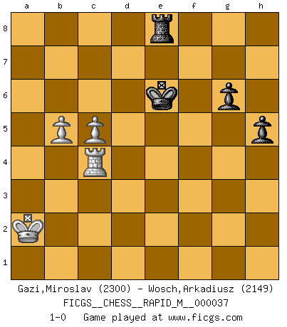 Last move : 1-0 2011 March 13 9:11:54 [Event "FICGS__CHESS__RAPID_M__000037"] [Site "FICGS"] [Date "2010.11.24"] [Round "1"] [White "Gazi,Miroslav"] [Black "Wosch,Arkadiusz"] [Result "1-0"] [WhiteElo "2300"] [BlackElo "2149"] 1.e4 c5 2.Nf3 Nc6 3.d4 cxd4 4.Nxd4 Nf6 5.Nc3 d6 6.Bc4 e6 7.Be3 Be7 8.Qe2 a6 9.Bb3 Qc7 10.O-O-O O-O 11.h4 Na5 12.g4 Nxb3+ 13.axb3 d5 14.exd5 Nxd5 15.Nxd5 exd5 16.h5 Re8 17.Kb1 Bg5 18.h6 Re4 19.Rhg1 g6 20.Qf3 Bxe3 21.fxe3 Qe7 22.Nf5 Bxf5 23.gxf5 Rd8 24.Rd3 Re5 25.Rg4 Re8 26.Rxd5 Rxe3 27.Qf4 Rh3 28.Ka2 b5 29.Qd2 Rh1 30.Rd6 Qe1 31.Qxe1 Rhxe1 32.Rxa6 Rh1 33.c4 bxc4 34.bxc4 Rxh6 35.fxg6 Rxg6 36.Raxg6+ fxg6 37.c5 Kf7 38.b4 h5 39.Rc4 Ke6 40.b5 1-0 Sicilian defense Queenside Castling by player White (move 10) Kingside Castling by player Black (move 10) 10 pieces endgame at move 35 : White KRRPP , Black KRRPP WHITE : King + 2 Rooks 2 Pawns BLACK : King + 2 Rooks 2 Pawns 9 pieces endgame at move 36 : White KRRPP , Black KRPP WHITE : King + 2 Rooks 2 Pawns BLACK : King + 1 Rook 2 Pawns 8 pieces endgame at move 36 : White KRPP , Black KRPP WHITE : King + 1 Rook 2 Pawns BLACK : King + 1 Rook 2 Pawns Player White won this chess game. Follow this game move after move (download)A bad plan is better than none at all. (Frank Marshall) Dein Körper muss in Topform sein. Dein Schach verfällt, wenn dein Körper verfällt. Der Körper kann nicht vom Geist getrennt werden. (Robert James Fischer) La partida mas dura de ganar es una partida ganada. (Emanuel Lasker) Les Echecs sont et restent toujours un combat, un combat intégral comme la boxe, la lutte ou un autre sport, et où il doit y avoir un vainqueur et un vaincu. (Joseph Emil Diemer) Begin at the beginning and go on till you come to the end; then stop. (Lewis Carrol, Alice in Wonderland)