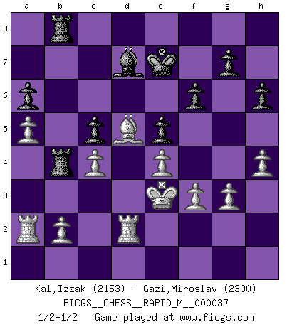 Last move : 1/2-1/2 2011 March 1 21:27:40 [Event "FICGS__CHESS__RAPID_M__000037"] [Site "FICGS"] [Date "2010.11.24"] [Round "1"] [White "Kal,Izzak"] [Black "Gazi,Miroslav"] [Result "1/2-1/2"] [WhiteElo "2153"] [BlackElo "2300"] 1.e4 c5 2.Nf3 d6 3.Bb5+ Nd7 4.d4 Ngf6 5.Nc3 cxd4 6.Qxd4 e5 7.Qd3 h6 8.Be3 Be7 9.O-O O-O 10.Bc4 a6 11.a4 Qc7 12.Nh4 Nc5 13.Bxc5 dxc5 14.Ng6 Rd8 15.Nxe7+ Qxe7 16.Nd5 Nxd5 17.Bxd5 Be6 18.c4 Rd6 19.Qc3 Bd7 20.Bxb7 Rb8 21.Bd5 Rdb6 22.Ra2 Rb3 23.Qd2 Bc8 24.Rd1 Qg5 25.f3 Qxd2 26.Rxd2 R3b4 27.a5 Kf8 28.g3 Ke7 29.h4 f6 30.Kf2 Bd7 31.Ke3 1/2-1/2 Sicilian : Canal-Sokolsky (Nimzovich-Rossolimo, Moscow) attack Kingside Castling by player White (move 9) Kingside Castling by player Black (move 9) This chess game ended in a draw. Follow this game move after move (download)One bad move nullifies forty good ones. (Horowitz) Wer der Ansicht ist, daß alle Schachspieler verrückt sind, wird durch Studium des Lebens von Emil Josef Diemer nicht auf andere Gedanken kommen. (Hans Ree) La mitad de las variaciones que son calculadas en una partida de torneo, resultan ser completamente superfluas. Desafortunadamente, nadie sabe por adelantado cual mitad. (Jan Tinman) Les échecs, c'est l'art d'analyser. (Mikhail Botvinnik) Life is like a ten-speed bicycle: most of us have gears we never use. (Charles M. Schulz)
