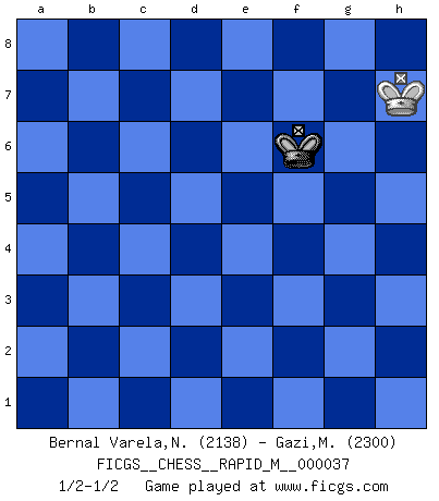 Last move : 1/2-1/2 2011 June 17 14:18:40 [Event "FICGS__CHESS__RAPID_M__000037"] [Site "FICGS"] [Date "2010.11.24"] [Round "1"] [White "Bernal Varela,Nelson"] [Black "Gazi,Miroslav"] [Result "1/2-1/2"] [WhiteElo "2138"] [BlackElo "2300"] 1.e4 c5 2.Nf3 d6 3.d4 cxd4 4.Nxd4 Nf6 5.Nc3 a6 6.Bg5 e6 7.f4 Qb6 8.Nb3 Be7 9.Qf3 Qc7 10.a4 Nbd7 11.Be2 h6 12.Bh4 b6 13.O-O O-O 14.Bg3 Bb7 15.Qe3 e5 16.Rad1 Rfe8 17.Kh1 Rac8 18.Nd2 Qc5 19.Qxc5 Nxc5 20.fxe5 dxe5 21.Bxe5 Nfxe4 22.Ndxe4 Nxe4 23.Rd7 Bc6 24.Ra7 Nxc3 25.Bxc3 Bxa4 26.Bxa6 Ra8 27.Rxa8 Rxa8 28.Bd3 Bd7 29.Be4 Rd8 30.Rd1 f6 31.h3 Kf7 32.Kh2 f5 33.Rf1 Bd6+ 34.Kh1 g6 35.g4 Re8 36.Bd5+ Kf8 37.Bf3 Be5 38.Bxe5 Rxe5 39.gxf5 Rxf5 40.Kg2 Ke7 41.Rf2 Be6 42.Rd2 Rg5+ 43.Kh2 Re5 44.Kg3 Rb5 45.c3 Rg5+ 46.Kh2 Rf5 47.Be4 Rg5 48.Bf3 Rc5 49.h4 Rc4 50.Kg3 b5 51.Be2 Re4 52.h5 gxh5 53.Bxb5 h4+ 54.Kf2 Rg4 55.Bf1 Rg5 56.Re2 Kd6 57.Re4 Bg4 58.Rd4+ Kc7 59.Rf4 h5 60.Kg1 Re5 61.Bg2 Re1+ 62.Rf1 Re3 63.Rf2 Kd6 64.Rd2+ Kc5 65.Kf2 Re5 66.Bf1 Kb6 67.Kg2 Re7 68.Rf2 Re3 69.Rd2 Kc5 70.Kf2 Rf3+ 71.Kg2 Re3 72.Kh2 Re1 73.Bg2 Kc4 74.Bd5+ Kb5 75.Kg2 Re5 76.Kg1 Kc5 77.Bb7 Re1+ 78.Kh2 Re3 79.Bd5 Rg3 80.Bb7 Rh3+ 81.Kg2 Kc4 82.Bd5+ Kc5 83.Kg1 Re3 84.Bb7 Re7 85.Bg2 h3 86.Bf1 Re1 87.Rf2 Kd5 88.Kh2 Ke4 89.Bxh3 Ke3 90.Rf8 Re2+ 91.Kg3 Rxb2 92.Bxg4 hxg4 93.Rc8 Rc2 94.Kxg4 Kd3 95.Kf4 Rxc3 96.Rxc3+ Kxc3 97.Kg5 Kd4 98.Kh6 Ke5 99.Kg7 Ke6 100.Kh8 Kf7 101.Kh7 Kf6 1/2-1/2 Sicilian : Najdorf, 7...Qb6 Kingside Castling by player White (move 13) Kingside Castling by player Black (move 13) 10 pieces endgame at move 53 : White KRBPP , Black KRBPP WHITE : King + 1 Rook 1 Bishop 2 Pawns BLACK : King + 1 Rook 1 Bishop 2 Pawns 9 pieces endgame at move 89 : White KRBPP , Black KRBP WHITE : King + 1 Rook 1 Bishop 2 Pawns BLACK : King + 1 Rook 1 Bishop 1 Pawn 8 pieces endgame at move 91 : White KRBP , Black KRBP WHITE : King + 1 Rook 1 Bishop 1 Pawn BLACK : King + 1 Rook 1 Bishop 1 Pawn 7 pieces endgame at move 92 : White KRBP , Black KRP WHITE : King + 1 Rook 1 Bishop 1 Pawn BLACK : King + 1 Rook 1 Pawn 6 pieces endgame at move 92 : White KRP , Black KRP WHITE : King + 1 Rook 1 Pawn BLACK : King + 1 Rook 1 Pawn 5 pieces endgame at move 94 : White KRP , Black KR WHITE : King + 1 Rook 1 Pawn BLACK : King + 1 Rook 4 pieces endgame at move 95 : White KR , Black KR WHITE : King + 1 Rook BLACK : King + 1 Rook 3 pieces endgame at move 96 : White KR , Black K WHITE : King + 1 Rook BLACK : King + 2 pieces endgame at move 96 : White K , Black K WHITE : King + BLACK : King + This chess game ended in a draw. Follow this game move after move (download)You sit at the board and suddenly your heart leaps. Your hand trembles to pick up the piece and move it. But what Chess teaches you is that you must sit there calmly and think about whether it's really a good idea and whether there are other better ideas. (Stanley Kubrick) Alle Schachspieler sollten auch ein Hobby haben. (Savielly Grigorievitsch Tartakower) El ganador de una partida es aquel jugador que hace el penúltimo error. (Savielly Tartakover) Les Echecs, c'est l'art de la guerre sans les charniers, c'est la résurrection des morts tombés au champ d'honneur, l'espoir perpétuel, la suprématie de l'intelligence sur la force, la culture de l'esprit. (F. Szpiner) They say poker is a zero-sum game. It must be, because every time I play my sum ends up zero. (Max Shapiro)