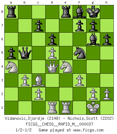Last move : 1/2-1/2 2010 December 6 20:56:41 [Event "FICGS__CHESS__RAPID_M__000037"] [Site "FICGS"] [Date "2010.11.24"] [Round "1"] [White "Vidanovic,Djordje"] [Black "Nichols,Scott"] [Result "1/2-1/2"] [WhiteElo "2148"] [BlackElo "2202"] 1.e4 e5 2.Nf3 Nc6 3.Bb5 a6 4.Ba4 Nf6 5.d4 exd4 6.O-O Be7 7.Re1 b5 8.Bb3 d6 9.Bd5 Nxd5 10.exd5 Ne5 11.Nxd4 O-O 12.a4 Bg4 13.Qd2 Bd7 14.Nc3 bxa4 15.Nxa4 Re8 16.b3 Qb8 17.Bb2 Qb7 18.Ne2 Ng6 19.Ng3 Bf8 20.Red1 h6 21.f3 a5 22.Bc3 Qb5 23.Ne4 Bf5 24.Re1 Ne7 25.Rad1 Bg6 26.Qd4 Nf5 27.Qd2 Ne7 28.Qd4 Nf5 1/2-1/2 Ruy Lopez : Morphy defense Kingside Castling by player White (move 6) Kingside Castling by player Black (move 11) This chess game ended in a draw. Follow this game move after move (download)Pawns: they are the soul of this game, they alone form the attack and defense. (Philidor) Glücklicherweise sind Großmeister Ruben Fines reine Schachbücher weniger phallozentrisch [als seine Schachpsychologie] und deswegen auch weniger lächerlich. (Nigel Short) El Ajedrez, como cualquier actividad creativa, solo puede existir a través del esfuerzo combinado de aquellos que tienen talento creativo y de aquellos que poseen la habilidad de organizar su trabajo creativo. (Mikhail Botvinnik) Le profane ne songe pas à la somme de jouissance dont il se prive, qui méconnaît ce jeu aux ressources aussi variées que passionnantes. (Jean-Marie Jeanton-Lamarche) To be champion requires more than simply being a strong player; one has to be a strong human being as well. (Anatoly Karpov)