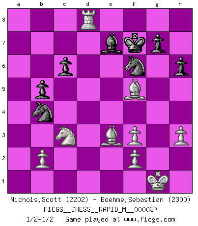 Last move : 1/2-1/2 2011 January 19 22:49:27 [Event "FICGS__CHESS__RAPID_M__000037"] [Site "FICGS"] [Date "2010.11.24"] [Round "1"] [White "Nichols,Scott"] [Black "Boehme,Sebastian"] [Result "1/2-1/2"] [WhiteElo "2202"] [BlackElo "2300"] 1.e4 e5 2.Nf3 Nc6 3.Bb5 a6 4.Ba4 Nf6 5.O-O Be7 6.Re1 b5 7.Bb3 d6 8.c3 O-O 9.h3 Bb7 10.d4 Re8 11.a4 h6 12.Nbd2 exd4 13.cxd4 Nb4 14.e5 dxe5 15.dxe5 Nfd5 16.e6 fxe6 17.axb5 axb5 18.Rxa8 Bxa8 19.Ne4 Nf6 20.Nc3 Qxd1 21.Bxe6+ Kf8 22.Rxd1 Bxf3 23.gxf3 c6 24.Bf5 Kf7 25.Be3 Rd8 26.Rxd8 1/2-1/2 Ruy Lopez : Closed Kingside Castling by player White (move 5) Kingside Castling by player Black (move 8) This chess game ended in a draw. Follow this game move after move (download)Chess problems demand from the composer the same virtues that characterize all worthwhile art: originality, invention, conciseness, harmony, complexity, and splendid insincerity. (Vladimir Nabokov) Fallen sollten polizeilich verboten werden. (Savielly Grigorievitsch Tartakower) Juega la Apertura como un libro, el Juego Medio como un mago y los Finales como una máquina. (Spielmann) Celui qui prend des risques peut perdre, celui qui n'en prend pas perd toujours. (Xavier Tartacover) Sometimes it pays to stay in bed in Monday, rather than spending the rest of the week debugging Monday's code. (Dan Salomon)