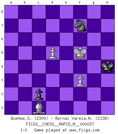 Last move : 1-0 2011 May 27 15:46:0 [Event "FICGS__CHESS__RAPID_M__000037"] [Site "FICGS"] [Date "2010.11.24"] [Round "1"] [White "Boehme,Sebastian"] [Black "Bernal Varela,Nelson"] [Result "1-0"] [WhiteElo "2300"] [BlackElo "2138"] 1.e4 c5 2.Nf3 d6 3.Bb5+ Bd7 4.Bxd7+ Qxd7 5.c4 g6 6.Nc3 Nc6 7.d4 cxd4 8.Nxd4 Nf6 9.f3 Bg7 10.Be3 O-O 11.Rc1 a6 12.Nxc6 bxc6 13.O-O Rfd8 14.Na4 Qe6 15.b3 Nd7 16.Rc2 c5 17.Rd2 Re8 18.Re1 Ne5 19.Kh1 h5 20.Bf2 g5 21.Be3 Qg6 22.Rf1 Rab8 23.Rd5 Rf8 24.Nc3 Kh8 25.Ne2 f5 26.exf5 Rxf5 27.Ng3 Rf7 28.Rg1 a5 29.Qe2 R7f8 30.Ne4 Rf5 31.Bc1 a4 32.bxa4 Rb4 33.a5 Ra4 34.a3 Rxa5 35.Qc2 Ra7 36.a4 Rf8 37.Bxg5 Rfa8 38.Bh4 Nf7 39.g4 hxg4 40.Rxg4 Qh7 41.Be1 Rxa4 42.Rh4 Qxh4 43.Bxh4 Ra1+ 44.Rd1 R8a2 45.Qb3 Rxd1+ 46.Qxd1 Ra1 47.Qxa1 Bxa1 48.Bxe7 Be5 49.Kg2 Kg7 50.h4 Kg6 51.Ng3 d5 52.cxd5 c4 53.Kf2 Bxg3+ 54.Kxg3 c3 55.Kf4 c2 56.Ba3 Kh5 57.Bc1 Kxh4 58.Kf5 1-0 Sicilian : Canal-Sokolsky attack, Sokolsky variation Kingside Castling by player Black (move 10) Kingside Castling by player White (move 13) 10 pieces endgame at move 52 : White KBNPPP , Black KBNP WHITE : King + 1 Bishop 1 Knight 3 Pawns BLACK : King + 1 Bishop 1 Knight 1 Pawn 9 pieces endgame at move 53 : White KBPPP , Black KBNP WHITE : King + 1 Bishop 3 Pawns BLACK : King + 1 Bishop 1 Knight 1 Pawn 8 pieces endgame at move 54 : White KBPPP , Black KNP WHITE : King + 1 Bishop 3 Pawns BLACK : King + 1 Knight 1 Pawn 7 pieces endgame at move 57 : White KBPP , Black KNP WHITE : King + 1 Bishop 2 Pawns BLACK : King + 1 Knight 1 Pawn Player White won this chess game. Follow this game move after move (download)Many have become Chess Masters, no one has become the Master of Chess. (Siegbert Tarrasch) Der vorletzte Fehler gewinnt. (Savielly Grigorievitsch Tartakower) Debemos de asegurarnos de que el Ajedrez no se convierta en un lenguaje muerto, muy interesante, pero solo para un grupo muy pequeño. (Sytze Faber) Ce qui est bien, c'est d'avoir tout un tas de pièces en prise : l'adversaire ne peut en prendre qu'une à la fois. Cité par Thierry Audin. Hardware: the parts of a computer that can be kicked. (Jeff Persis)