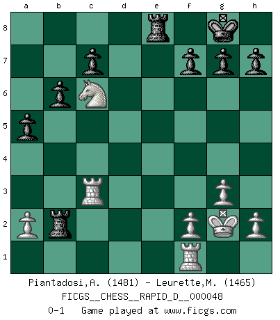 Last move : 0-1 2010 December 26 23:46:0 [Event "FICGS__CHESS__RAPID_D__000048"] [Site "FICGS"] [Date "2010.11.24"] [Round "1"] [White "Piantadosi,Angelo"] [Black "Leurette,Marc-Antoine"] [Result "0-1"] [WhiteElo "1481"] [BlackElo "1465"] 1.c4 e5 2.Nc3 Nf6 3.d3 Bb4 4.Bd2 Nc6 5.g3 d5 6.cxd5 Nxd5 7.Bg2 O-O 8.Nxd5 Bxd2+ 9.Qxd2 Bf5 10.Nb4 Nxb4 11.Qxb4 Rb8 12.Nf3 Re8 13.O-O e4 14.dxe4 Bxe4 15.Rfd1 Qf6 16.Rac1 Rbc8 17.Nd4 Bxg2 18.Kxg2 b6 19.Nc6 a5 20.Qa3 Rxe2 21.Rf1 Rce8 22.Qc3 Qxc3 23.Rxc3 Rxb2 0-1 English Opening Kingside Castling by player Black (move 7) Kingside Castling by player White (move 13) Player Black won this chess game. Follow this game move after move (download)Fischer is completely natural. He plays no roles. He's like a child. Very, very simple. (Zita Rajcsanyi) Wenn ich Weiß habe gewinne ich weil ich Weiß habe, wenn ich Schwarz habe gewinne ich weil ich Bogoljubov bin. (Efim Bogoljubov) Fischer es el jugador mas fuerte del mundo. De hecho, el jugador mas fuerte que jamas haya existido. (Larry Evans) On entre au jeu d'Echecs comme on entre en Religion. Pour le joueur d'Echecs, la partie d'Echecs c'est l'office, la messe, le défilé du 1er Mai, le dépôt de gerbe au Monument aux Morts. C'est un drame sacré. (Michel Roos) Cactus - It is depressed cucumber. (Ilmars Cirulis)