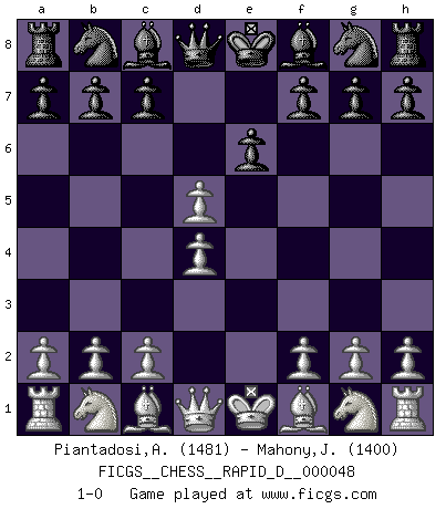 Last move : 1-0 2010 December 29 22:57:40 [Event "FICGS__CHESS__RAPID_D__000048"] [Site "FICGS"] [Date "2010.11.24"] [Round "1"] [White "Piantadosi,Angelo"] [Black "Mahony,Jonathan"] [Result "1-0"] [WhiteElo "1481"] [BlackElo "1400"] 1.e4 e6 2.d4 d5 3.exd5 1-0 This chess game has been lost on time (started : 2010.11.24 18:23:44) French : Exchange variation Player White won this chess game. Follow this game move after move (download)In Chess, at least, the brave inherit the earth. (Edmar Mednis) Je älter ich werde, um so mehr schätze ich die Bauern. (Paul Keres) Un buen jugador siempre tiene buena suerte. (José Raúl Capablanca) Ce n'est pas pour s'amuser qu'il joue aux échecs : il célèbre un culte. (Vladimir Nabokov) It is the aim of the modern school, not to treat every position according to one general law, but according to the principle inherent in the position. (Richard Reti)