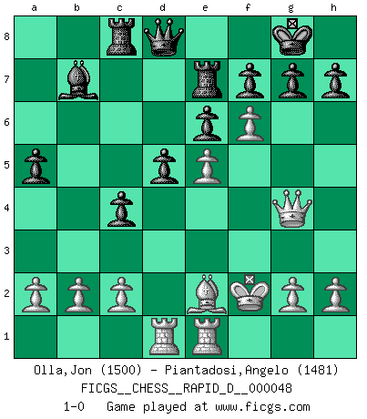 Last move : 1-0 2011 January 9 23:46:6 [Event "FICGS__CHESS__RAPID_D__000048"] [Site "FICGS"] [Date "2010.11.24"] [Round "1"] [White "Olla,Jon"] [Black "Piantadosi,Angelo"] [Result "1-0"] [WhiteElo "1500"] [BlackElo "1481"] 1.e4 c5 2.f4 d6 3.Nf3 Nf6 4.Nc3 e6 5.d4 cxd4 6.Nxd4 Nc6 7.Nxc6 bxc6 8.Be3 Be7 9.Bd3 Bb7 10.O-O O-O 11.Qe2 a5 12.Rad1 d5 13.Bf2 c5 14.e5 Nd7 15.Qg4 Re8 16.Rfe1 c4 17.Be2 Bc5 18.Nb5 Bxf2+ 19.Kxf2 Nb6 20.Nd6 Re7 21.f5 Nc8 22.Nxc8 Rxc8 23.f6 1-0 Sicilian : Grand Prix attack Kingside Castling by player White (move 10) Kingside Castling by player Black (move 10) Player White won this chess game. Follow this game move after move (download)Fischer was a master of clarity and a king of artful positioning. His opponents would see where he was going but were powerless to stop him. (Bruce Pandolfini) Wenn ein Kopf und ein Buch zusammenstoßen und es klingt hohl, ist es denn allemal im Buche? (Georg Christoph Lichtenberg) El Ajedrez es el arte del análisis. (Mikhail Botvinnik) Votre prénom est 'Tactique', votre deuxième prénom est 'Tactique' et votre nom est 'Tactique'. (Ken Smith) You can think I'm wrong, but that's no reason to quit thinking. (Gregory House, House M.D.)