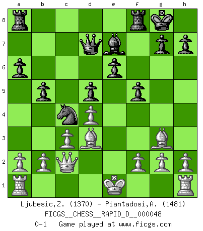 Last move : 0-1 2011 January 28 23:39:36 [Event "FICGS__CHESS__RAPID_D__000048"] [Site "FICGS"] [Date "2010.11.24"] [Round "1"] [White "Ljubesic,Zeljko"] [Black "Piantadosi,Angelo"] [Result "0-1"] [WhiteElo "1370"] [BlackElo "1481"] 1.e4 c6 2.Nf3 d5 3.exd5 cxd5 4.c3 Nf6 5.Bb5+ Bd7 6.Qb3 Nc6 7.d4 e6 8.Bf4 a6 9.Be2 Be7 10.Ne5 b5 11.Nd2 O-O 12.Ndf3 Ne8 13.Nxd7 Qxd7 14.Ne5 Nxe5 15.Bxe5 f6 16.Bg3 Nd6 17.Bd3 Nc4 18.Qc2 f5 0-1 This chess game has been lost on time (started : 2010.11.24 18:23:44) Caro-Kann defense Kingside Castling by player Black (move 11) Player Black won this chess game. Follow this game move after move (download)You are for me the Queen on d8 and I am the Pawn on d7 !! (Eduard Gufeld) Es hat in meinem Leben Zeiten gegeben, in denen das Schachspiel, wenn nicht zum Lebenszweck, so doch zu einem regelrechten Lebensersatz geworden ist. Man fühlt sich in solchen Zeiten nicht so, als besäße man eine göttliche Gabe, sondern eher so, als sei man von ihr besessen. (Garry Kasparov) La estratégia requiere pensar, la táctica requiere observación. (Max Euwe) Karpov est une pièce de musée. (Garry Kasparov) Go and wake up your luck. (Persian saying)