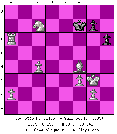 Last move : 1-0 2011 February 26 20:43:48 [Event "FICGS__CHESS__RAPID_D__000048"] [Site "FICGS"] [Date "2010.11.24"] [Round "1"] [White "Leurette,Marc-Antoine"] [Black "Salinas,Marcelo"] [Result "1-0"] [WhiteElo "1465"] [BlackElo "1385"] 1.e4 e5 2.Nf3 d6 3.Bc4 Nf6 4.d4 Nxe4 5.dxe5 Bg4 6.Qd5 Be6 7.Qxe4 d5 8.Bxd5 Bxd5 9.Qd3 Bxf3 10.Qxf3 Nc6 11.O-O Qe7 12.Qd1 Nxe5 13.Re1 Rd8 14.Bd2 Qf6 15.Qe2 Rd5 16.c4 Rc5 17.b3 Be7 18.Bc3 Bd6 19.Nd2 O-O 20.Ne4 Qh4 21.Nxc5 Nf3+ 22.Qxf3 Qxh2+ 23.Kf1 Qh1+ 24.Ke2 Re8+ 25.Kd3 Rxe1 26.Rxe1 Qh6 27.Re8+ Bf8 28.Ne6 Qg6+ 29.Ke2 Qc2+ 30.Bd2 h6 31.Rxf8+ Kh7 32.Qxf7 Qe4+ 33.Be3 Qc2+ 34.Kf3 Qd1+ 35.Kg3 Qd6+ 36.Bf4 Qd3+ 37.f3 Qg6+ 38.Qxg6+ Kxg6 39.Nxc7 a6 40.Rb8 b5 41.Rb6+ Kf7 42.Rxa6 bxc4 43.bxc4 1-0 Philidor's defense Kingside Castling by player White (move 11) Kingside Castling by player Black (move 19) Player White won this chess game. Follow this game move after move (download)No Chess Grandmaster is normal; they only differ in the extent of their madness. (Viktor Korchnoi) Ich verlor meine Bürgerrechte, mein Gehalt wurde mir nicht mehr bezahlt und ich wurde zensiert und durfte nicht mehr ins Ausland reisen. [nach dem Match Fischer-Taimanov 6:0] (Mark Taimanov) No solamente yo pronostico su triunfo sobre Botvinnik, sino que me adelanto y digo que probablemente Fischer es el jugador de Ajedrez mas grande que haya existido. (John Collins) Le jeu d'échecs fait naître et fortifie en nous plusieurs qualités précieuses dans le cours de l'existence, telles que la prévoyance, la circonspection, la prudence, et la persévérance. (Benjamin Franklin - 1783, la morale des échecs) Only sick music makes money today. (Friedrich Nietzsche)